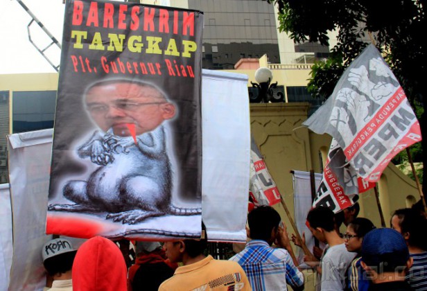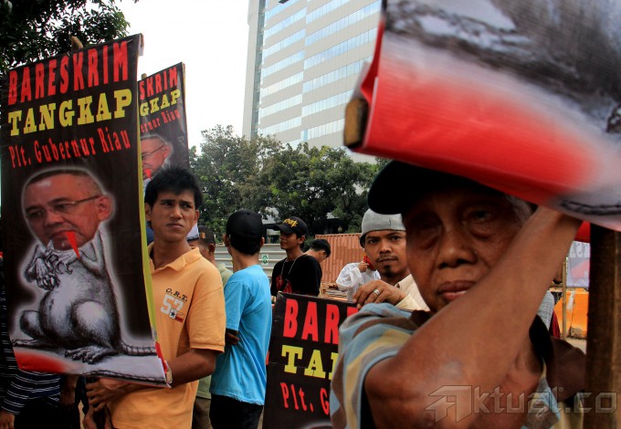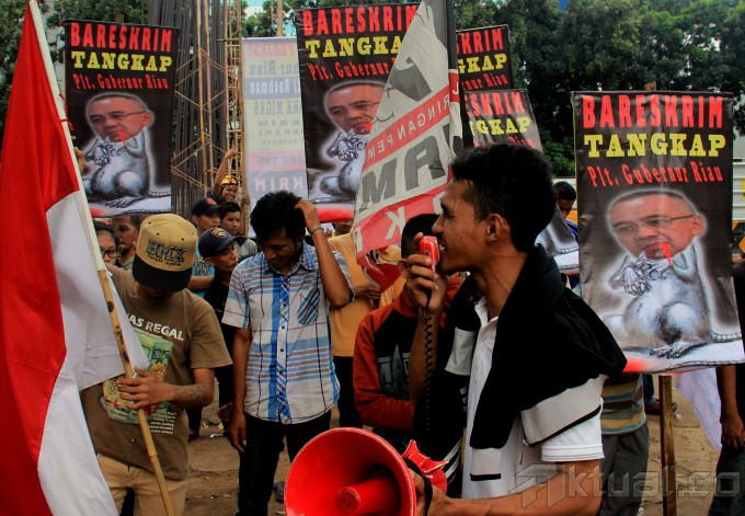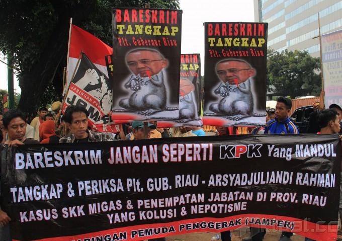 Ratusan massa yang tergabung dalam Jaringan Pemuda Penggerak (JAMPER) melakukan aksi di depan Mabes Polri, Jalan Trunojoyo, Jakarta Selatan, Kamis (4/6/2015). Dalam aksinya JAMPER mendesak Bareskrim segera menangkap PLT Gubenur Riau yang didguga telah melakukan korupsi dan menerima gratifikasi waktu menjadi anggota Komisi VII DPR-RI. AKTUAL/MUNZIR