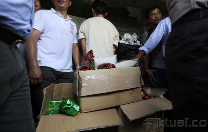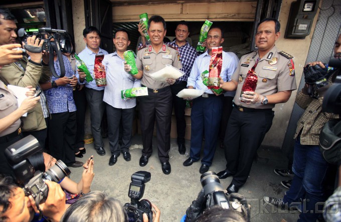 Wakapolda Metro Jaya Brigadir Jenderal Sudjarno (tengah) didampingi Kabid Humas Komisaris Besar Rikwanto, memperlihatkan narkoba hasil sitaan seberat 90 kilogram sabu senilai lebih Rp 100 miliar di sebuah lokasi di Jalan Biak, Jakarta Pusat, Rabu (30/4/2014). Petugas menangkap seorang berinisial LS yang diduga merupakan sindikat sabu kelas atas yang beroperasi di wilayah Jakarta dan kota-kota besar di Indonesia. Penyitaan sabu tersebut tercatat sebagai salah satu kasus besar di Ibukota selama dua tahun terakhir ini. Pengungkapan tersebut bermula dari informasi warga dan patugas langsung ke tempat kejadian perkara dan mengamankan 90 kg sabu yang berasal dari Hong Kong. Aktual/Tino Oktaviano