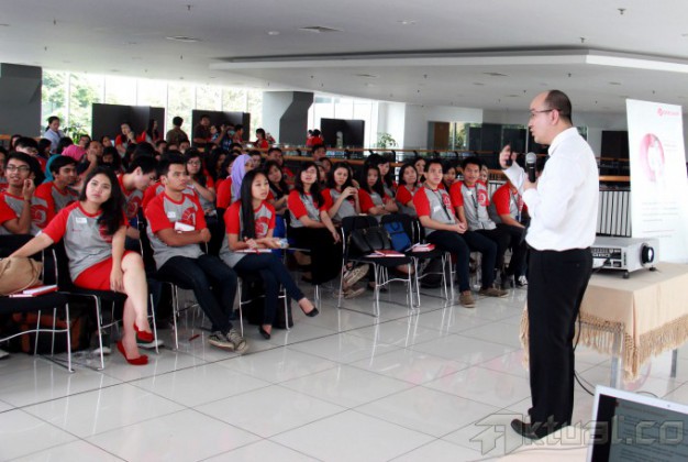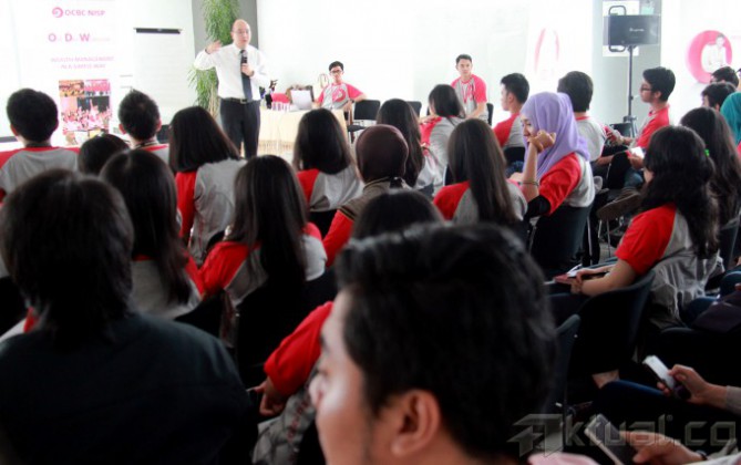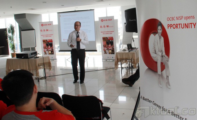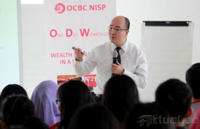 Senior Corporate Executive Bank OCBC NISP, Ka Jit memberikan bekal pengetahuan mengenai dunia perbankan dalam program, One Day Workshop di Universitas Bina Nusantara (Binus), Jakarta, Senin (12/5/2014). Bank OCBC NISP kembali menggelar program One Day Workshop untuk mahasiswa di berbagai kota di Indonesia yang diharapkan dapat menjadi bekal pengetahuan jika lulus nanti. Aktual/Tino Oktaviano