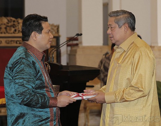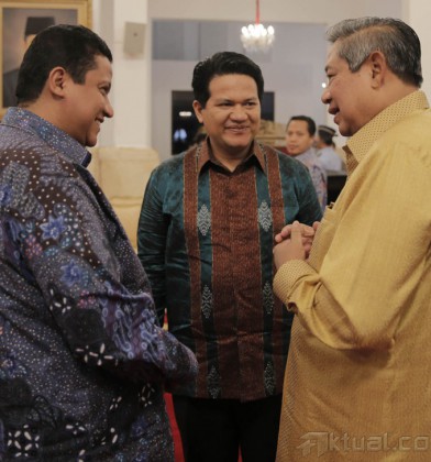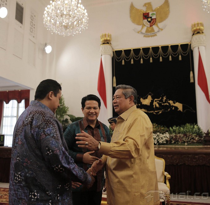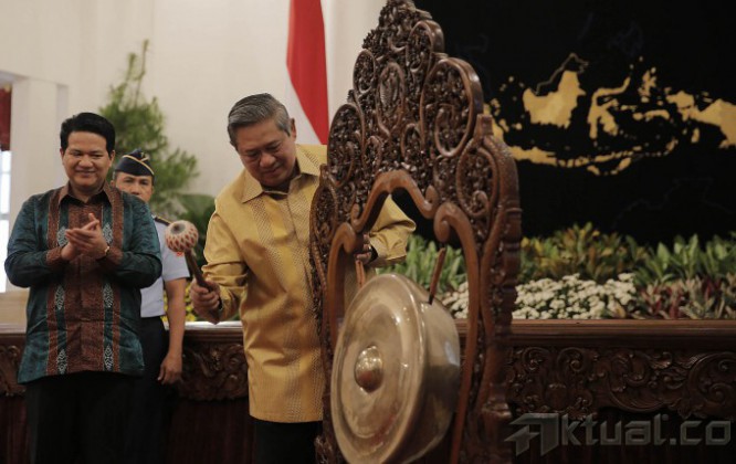 Presiden Susilo Bambang Yudhoyono (SBY) didampingi Ketua Komisi Pemilihan Umum (KPU) Husni Kamil Manik (kiri) saat memukul gong pembukaan Rapat Evaluasi dan Pelaporan Penyelenggaraan Pemilu 2014 di Istana Negara, Jakarta, Selasa (14/10/2014). Dalam rapat tersebut, Presiden SBY memastikan selama ini kinerja KPU tidak diintervensi oleh apapun dan siapapun. AKTUAL/Abror/presidenri.go.id