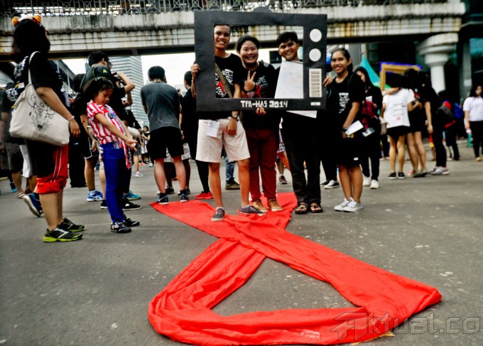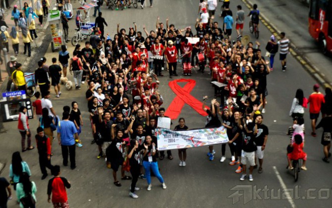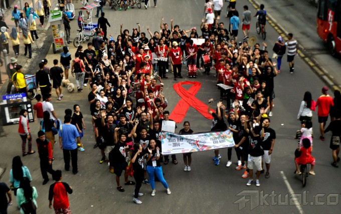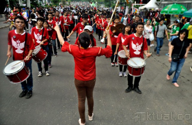 Puluhan anak sekolah yang mengatasnamakan Tim Peduli AIDS melakukan kampanye bahaya terhadap AIDS saat acara Car Free Day, di jalan Sudirman, Jakarta, Minggu (30/11/2014). Dalam aksinya Tim Peduli AIDS mengajak masyarakat tentang bahayanya AIDS dan dengan di isi acara Drum Band. AKTUAL/MUNZIR