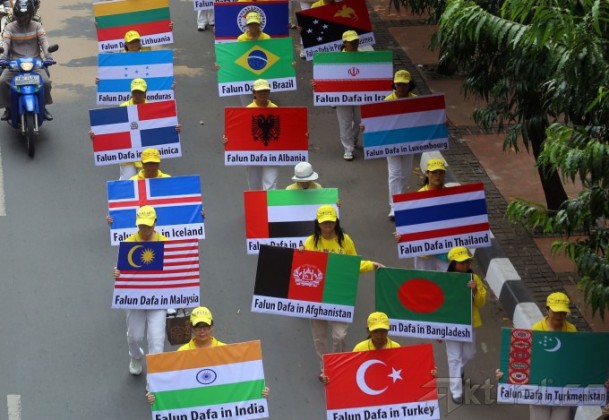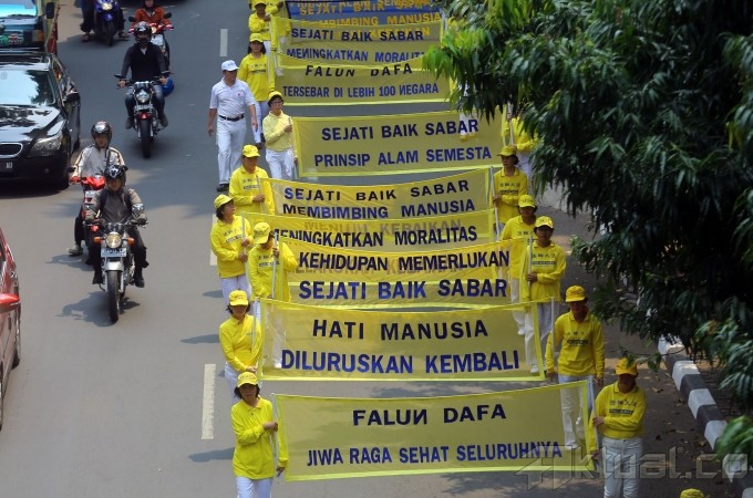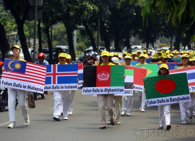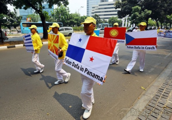 Ratusan praktisi Falun Gong atau Falun Dafa Indonesia melakukan longmarch saat aksi di Jalan Sudirman, Jakarta, sabtu (12/10/2013). Falun Gong menghimbau Partai Komunis Tiongkok menghentikan penindasan dan pengambilan organ secara paksa terhadap saudara-saudara mereka di Tiongkok. Juga meminta pemerintah Indonesia juga dihimbau turut berpartisipasi menentang kekejaman ini karena HAM merupakan hak universal. Kejahatan ini kini turut ditentang oleh seluruh masyarakat di dunia. Aktual/Tino Oktaviano