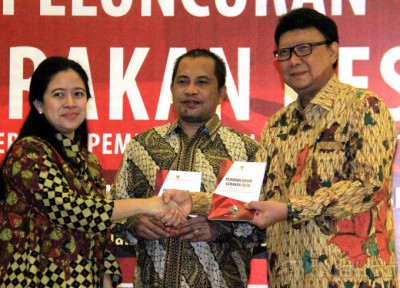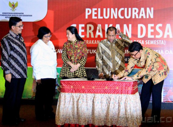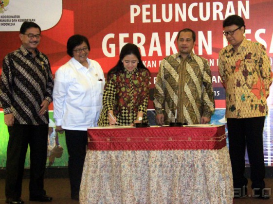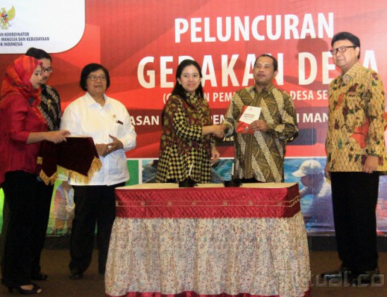 Menko Pembangunan Manusia dan Kebudayaan (PMK) Puan Maharani memberikan buku Gerakan Desa kepada Menteri Desa, Pembangunan Daerah Tertinggal dan Transmigrasi Marwan Jafar dan Menteri Dalam Negeri Tjahjo Kumolo di kantor PMK, Jakarta, Selasa (7/4/2015). Kementerian bidang PMK meresmikan ‘Gerakan Desa’ dimana Gerakan ini akan mengkoordinasikan semua program pembangunan desa untuk memajukan desa tertinggal. AKTUAL/MUNZIR