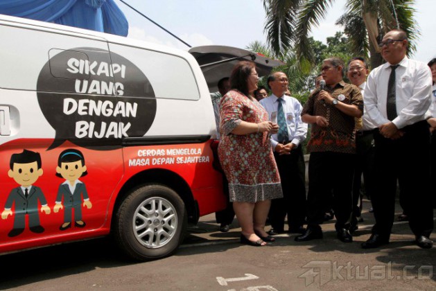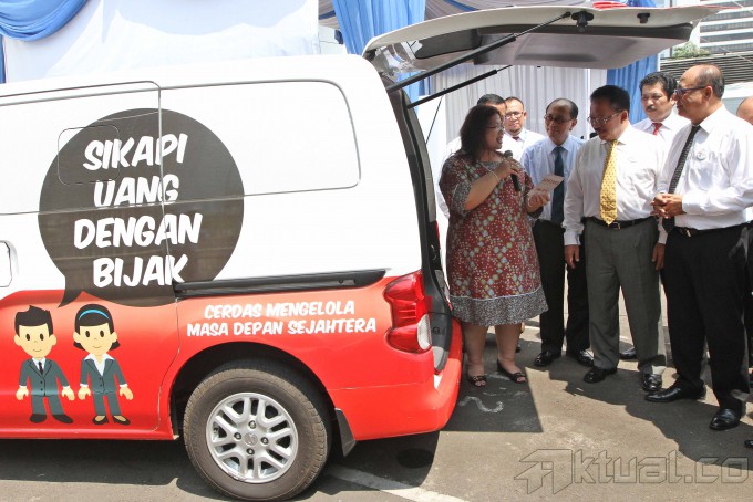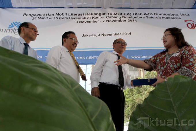Deputi Direktur Edukasi dan Literasi Otoritas Jasa Keuangan (OJK) Lasmaida Gultom (kiri) berbincang dengan Direktur Utama Bumi Putera Madjdi Ali (dari kanan), Wakil Direktur Utama Bima Aranta, Direktur Kepatuhan dan Pengawasan Internal Brata Antakusuma, dan Direktur Teknik dan Aktuaria Indra Catarya Situmeang dan disela-sela acara peluncuran pengoperasian mobil literasi keuangan (SiMOLEK) di Jakarta, Senin (3/11/2014). Perusahaan asuransi tersebut bekerja sama dengan OJK dalam mendukung edukasi literasi keuangan dengan menggelar kegiatan menggunakan 20 unit mobil SiMOLEK di 15 kota di Indonesia pada 3-7 November 2014. AKTUAL/STR