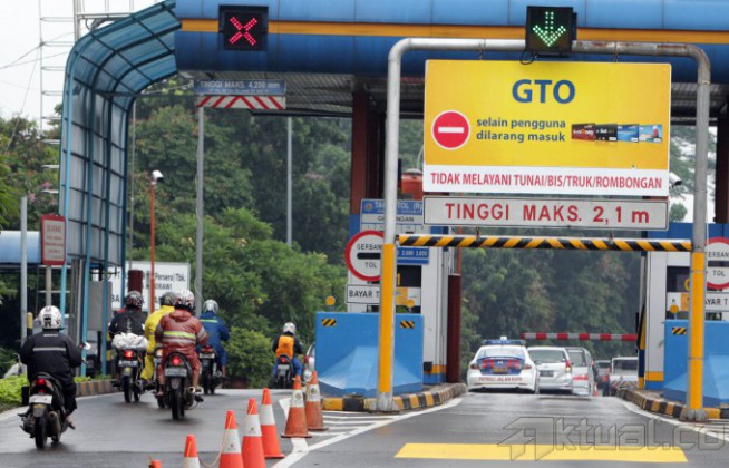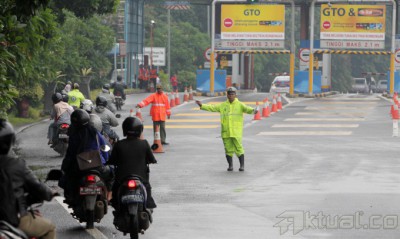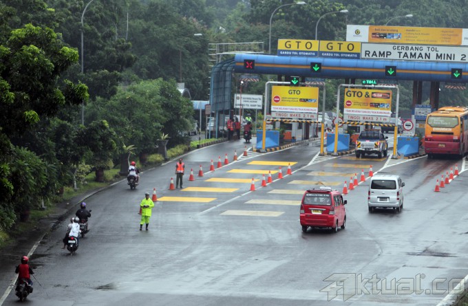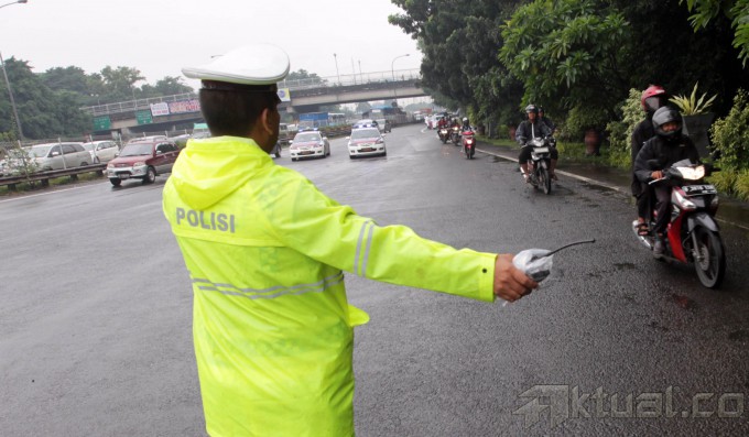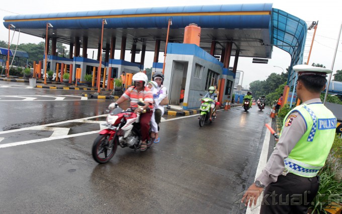 Polisi mengarahkan pengendara sepeda motor masuk menuju tol dalam kota di pintu tol Taman Mini 2, Jakarta Timur, Senin (13/1/2014). Akibat banjir di kawasan hek Kramat Jati, pengelola jalan tol Jakarta Outer Ring Road mengizinkan sepeda motor masuk ke jalan tol, setelah akses jalan menuju Cawang putus karena Cawang. Aktual/Tino Oktaviano