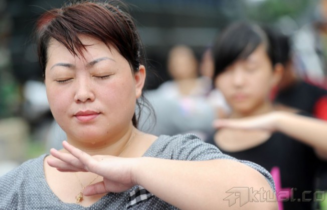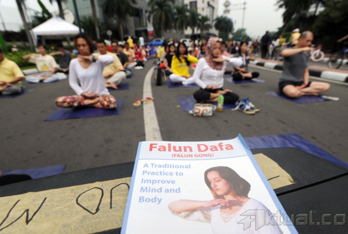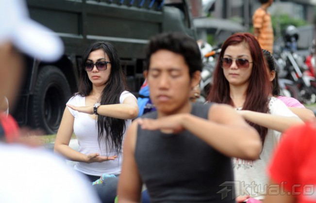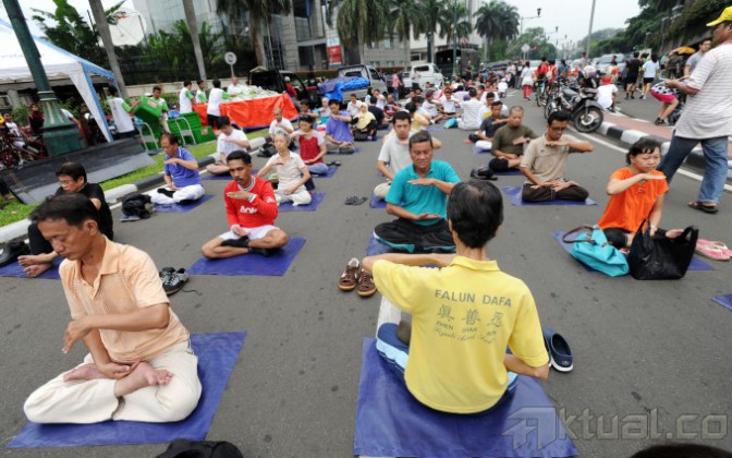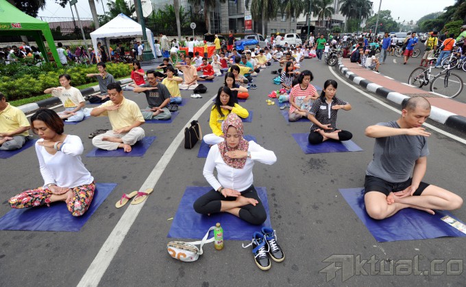 Pengunjung car free day mengikuti meditasi gratis yang diadakan oleh Falun Dafa (Falun Gong) Indonesia di Bundaran HI, Jakarta, Minggu (11/5/2014)). Kegiatan meditasi Falun Dafa dilakukan secara gratis dan bebas untuk seluruh warga yang sedang mengikuti car free day di Bundaran HI. Aktual/Tino Oktaviano