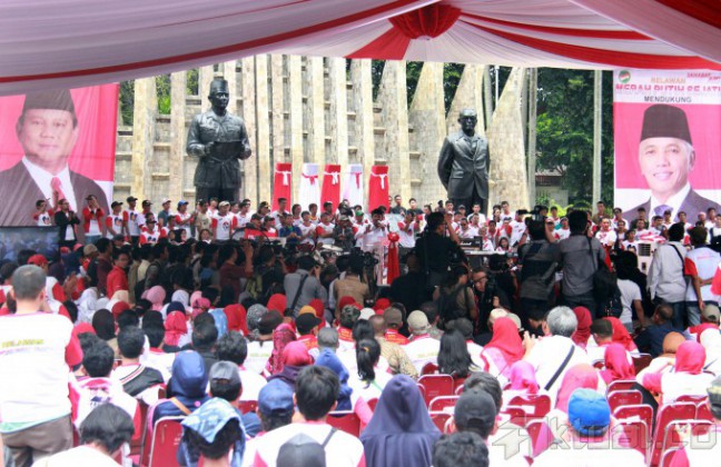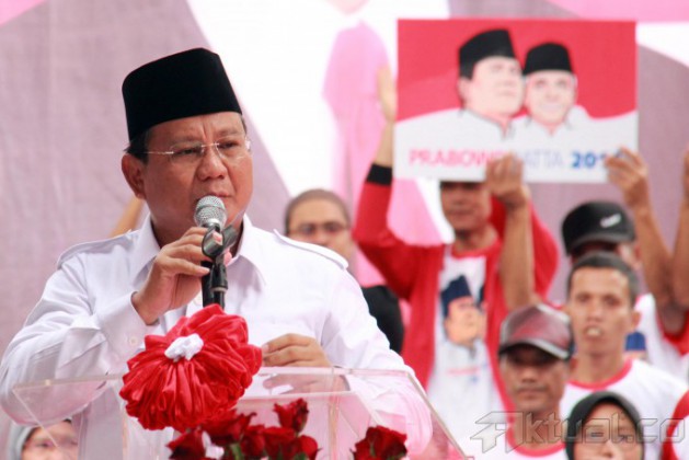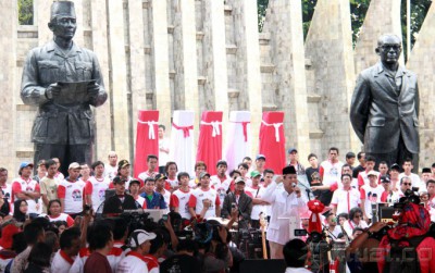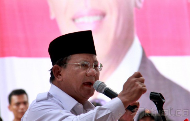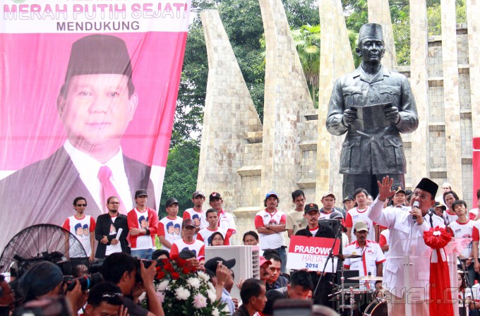 Capres Prabowo Subianto berpidato saat menghadiri deklarasi Aliansi Rakyat Bersatu (ARB) yang mendukung pasangan Prabowo-Hatta di Tugu Proklamasi, Jakarta, Selasa (10/6/2014). ARB mendukung pasangan Prabowo-Hatta karena memiliki komitmen yang kuat untuk mengangkat harkat dan martabat bangsa. Aktual/Tino Oktaviano