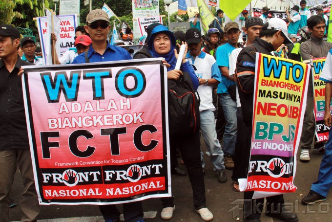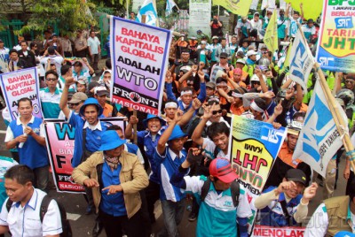 Sekitar 2.500 buruh dari Front Nasional Tolak Badan Penyelenggara Jaminan Sosial (BPJS), menggelar aksi di kantor Kemenakertrans, Jakarta Selatan. Kamis (5/12/2013). Aksi buruh ini diikuti oleh massa dari FSPT, KLN, SBMI, GSBI, SRMI, SPT DAN SPINDO. Buruh menolak UU No. 24 TAHUN 2011 TENTANG BPJS DAN UU NO. 40 TAHUN 2004 TENTANG SJSN, dan meminta Segera keluarkan perpu Jaminan Sosial karena UU BPJS adalah bentuk penghianatan terhadap rakyat pekerja/buruh. Aktual/Tino Oktaviano