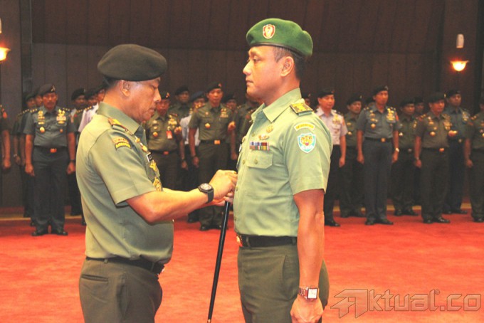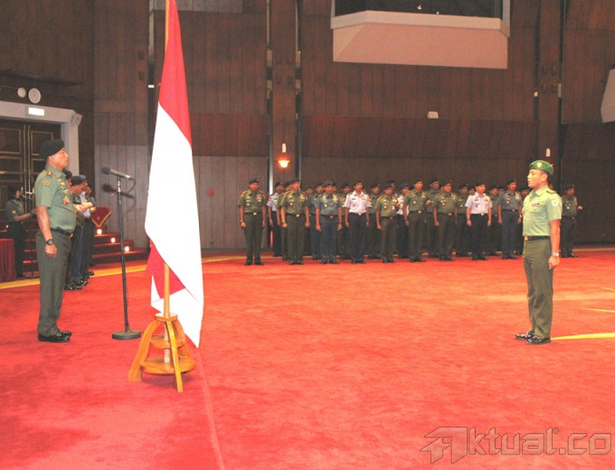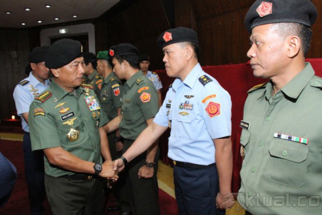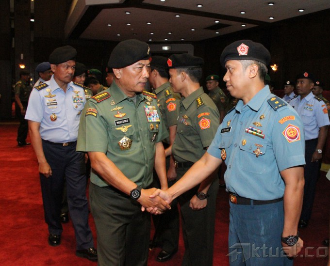 Panglima TNI Jenderal Moeldoko menyalami peserta usai pembukaan Sekolah Manajemen dan Analisis Intelijen TNI Angkatan II Tahun 2015, di Aula Gatot Subroto Mabes TNI Cilangkap Jakarta Timur, Senin (20/4/2015). Intelijen TNI harus memiliki kapasitas dan kapabilitas, meskipun pertumbuhan ekonomi nasional masih belum bisa memenuhi kebutuhan anggaran TNI secara utuh, untuk membangun arsitektur Intelijen TNI yang perkasa. AKTUAL/PUSPEN TNI