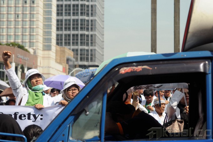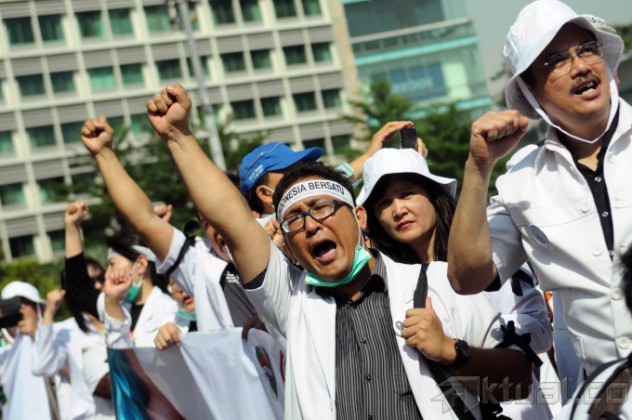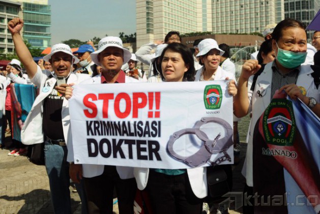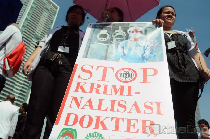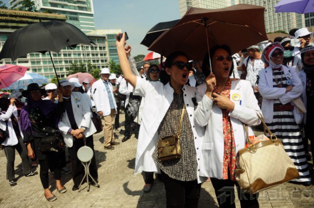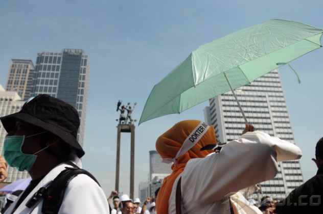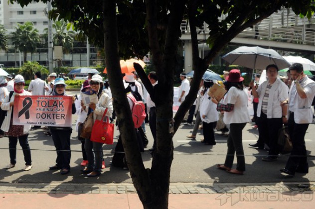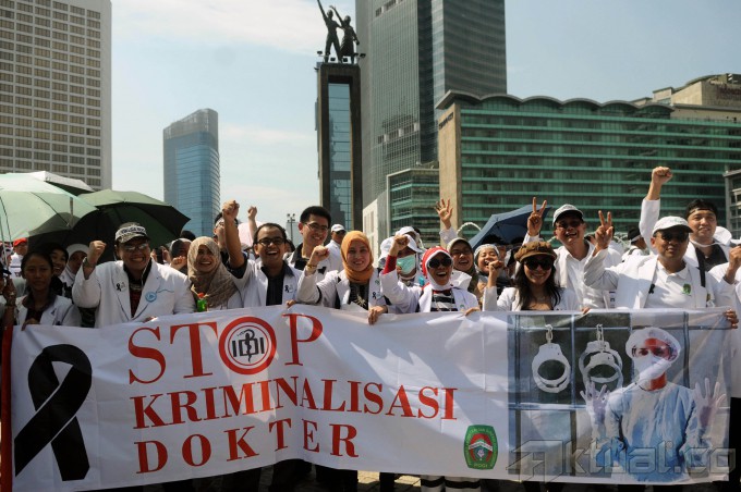 Ratusan Dokter Indonesia Bersatu melakukan aksi solidaritas tolak kriminalisasi dokter di Bundaran Hotel Indonesia, Jakarta, Rabu (27/11/2013). Aksi solidaritas serentak ini sebagai respon terhadap dokter Dewa Ayu yang divonis bersalah karena kelalaian yang berakibat meninggalnya pasien. Aktual/Tino Oktaviano