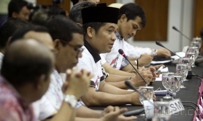 Sejumlah aktivis LSM yang tergabung dalam Gerakan Dekrit Rakyat Indonesia membacakan dekrit untuk kedaulatan rakyat di Gedung KPU Pusat, Jakarta, Selasa (18/3/2014). Dekrit ini berisikan 10 agenda prioritas bangsa yang harus dituntuskan oleh partai pemenang pemilu dan presiden terpilih nantinya. Aktual/Tino Oktaviano