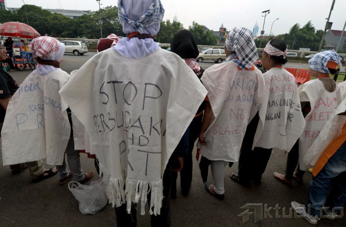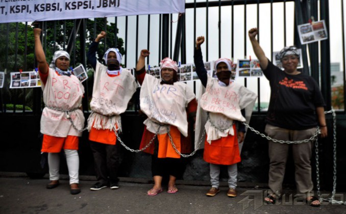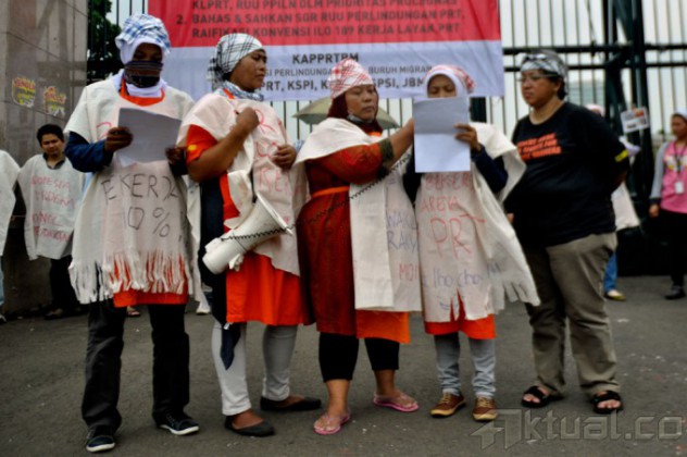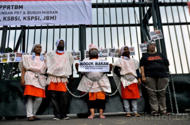Puluhan Pembantu Rumah Tangga (PRT) yang tergabung dalam Jaringan Nasional Advokasi Pekerja Rumah Tangga (JALA PRT), melakukan aksi mogok makan dan merantai diri di depan gedung DPR, Selasa (25/11/2014). Dalam aksi tersebut para Pembantu Rumah Tangga (PRT) menuntut Penetapan RUU Perlindungan Pekerja Rumah Tangga & Ratifikasi Konvensi ILO 189 Situasi Kerja Layak dalam Prioritas Prolegnas 2015 & Pembahasan Segara. AKTUAL/MUNZIR
