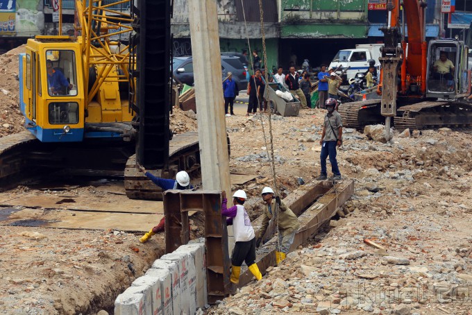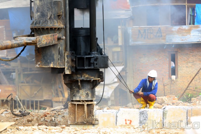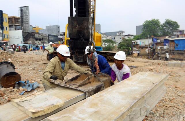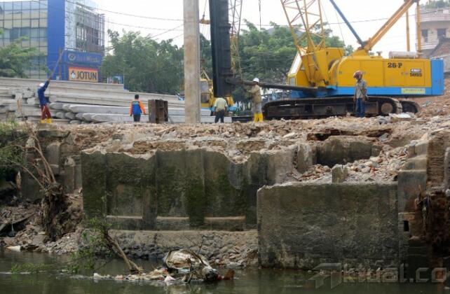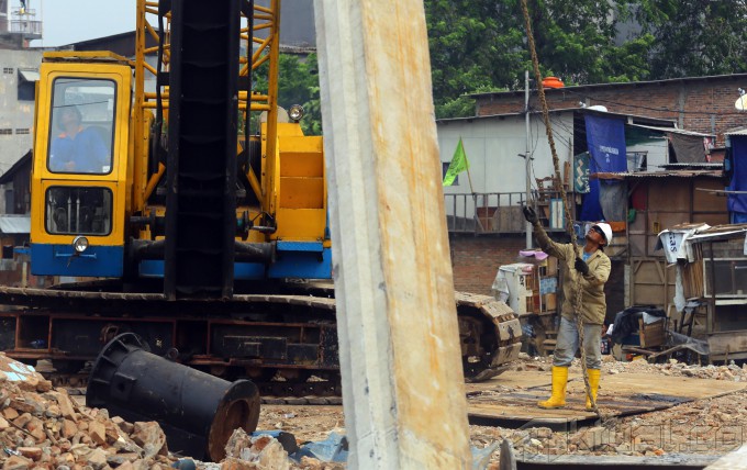 Sejumlah pekerja dengan menggunakan alat berat seperti eskavator dan crane melakukan proses normalisasi Kali Ciliwung di Jalan Jatinegara Barat, Jakarta, Jumat (5/9/2014). Setelah beberapa bangunan ruko digusur, kini proses pemasangan turap di Kali Ciliwung mulai dilakukan untuk normalisasi kali Ciliwung. Aktual/Tino Oktaviano