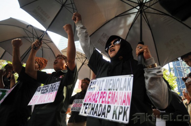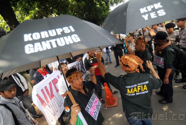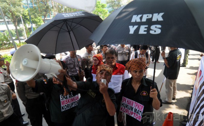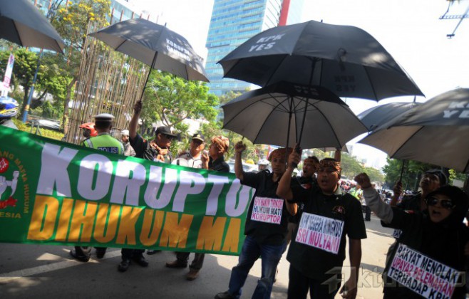 Sejumlah orang yang tergabung salam Laskar anti korupsi pejuang 45, menggelar demonstrasi di depan pengadilan tindak pidana korupsi Jakarta, Jalan Rasuna Said, Kuningan, Jakarta Selatan, Jumat (9/5/2014). Dalam aksinya, Dewan Pimpinan Pusat Laki 45, menyuarakan agar Wakil Presiden Boediono untuk diadili oleh Komisi Pemberantasan Korupsi (KPK), karena dinilai menjadi dalang dikucurkannya bailout Century senilai Rp 6,7 triliun. Aktual/Tino Oktaviano