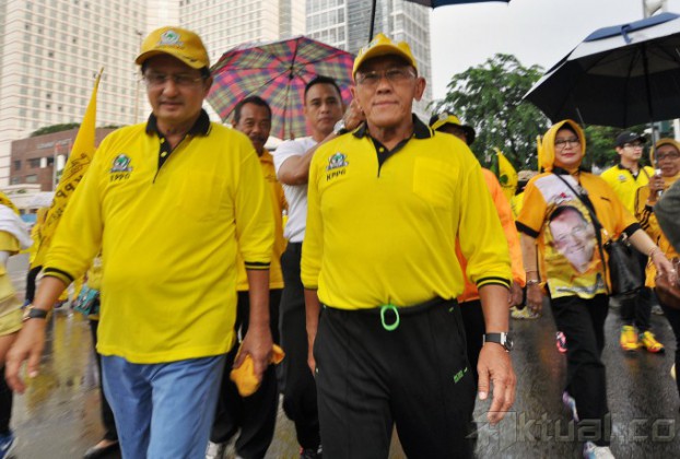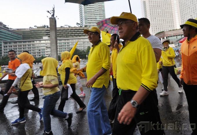 Ketua Umum Partai Golkar versi Munas Bali, Aburizal Bakrie (tengah), Wakil Ketua Umum Golkar Fadel Muhamad (Kedua kanan) bersama bersama sejumlah Kader Kesatuan Perempuan Partai Golkar (KPPG) berjalan santai saat Hari Bebas Kendaraan Bermotor di Jakarta, Minggu (8/2/2015). Jalan sehat tersebut merupakan bentuk sosialisasi kepada masyarakat bahwa KPPG sebagai sayap partai Golkar dapat memberikan dampak positif untuk menyokong suara Golkar pada Pemilu 2019. AKTUAL/MUNZIR