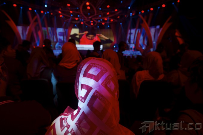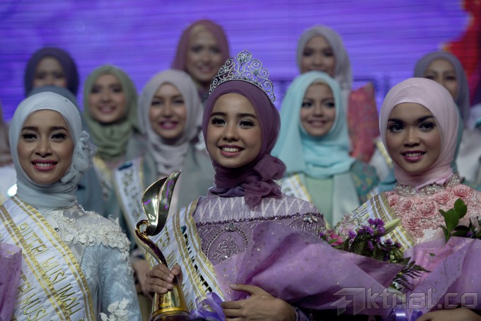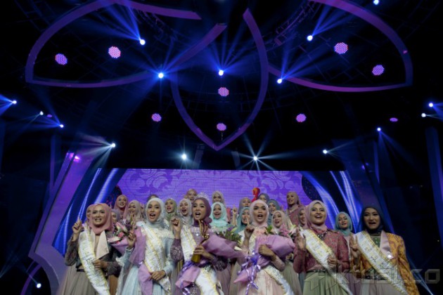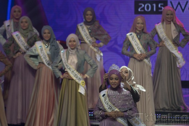 Finalis dari Medan, Sumatera Utara, Nesa Aqila Herryanto (tengah) menerima ucapan selamat dari finalis lainnya setelah dinyatakan sebagai pemenang dalam Malam Puncak Pemilihan Puteri Muslimah Indonesia 2015 di Studio Indosiar, Jakarta, Rabu malam (13/5). Dalam ajang kecantikan tersebut, kriteria pemenang dilihat dari kecantikan serta akhlak mulia. ANTARA FOTO/Rosa Panggabean
