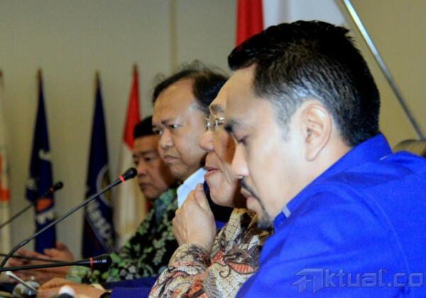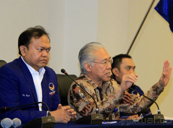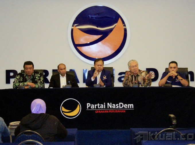 Dari kiri ke kanan, Ketua Fraksi DPRD DKI Jakarta Partai Nasdem Bestari Barus, Ketua Fraksi DPR Victor Bangtilu Laiskodat, Sekjen Partai Nasdem Patrice Rio Capella, Ketua Bapilu Partai Nasdem Enggartiasto Lukita dan Ketua DPW Partai Nasdem DKI Jakarta Syahroni saat jumpa pers di Kantor DPP Partai Nasdem Jalan Soeroso, Jakrat Pusat, Senin (2/3/2015). Dalam menggelar jumpa persnya DPP Partai Nasdem mengintruksikan Fraksi Partai Nasdem DPRD DKI Jakarta untuk menarik dukungannya dalam Hak Angket Ahok dan keluar dalam anggota Angket DPRD DKI Jakarta. AKTUAL/MUNZIR