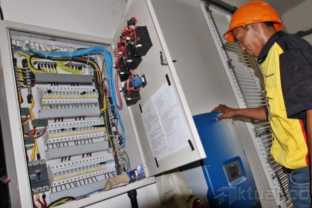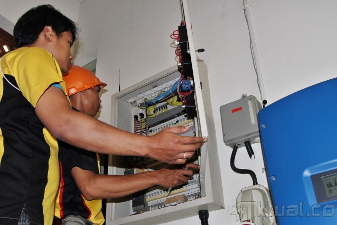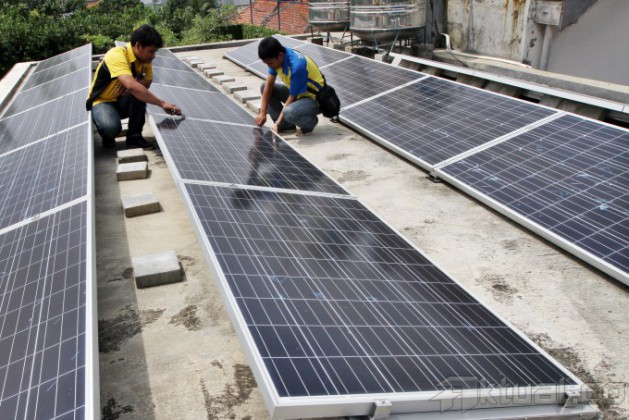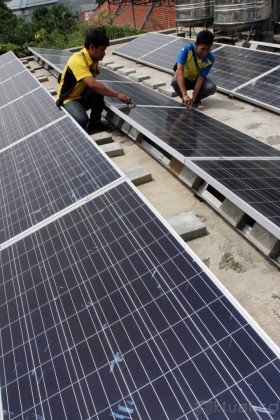 Pekerja memasang panel surya tenaga listrik di sebuah rumah di Kawasan, Menteng, Jakarta Pusat, Senin (25/11/2013). PT Perusahaan Listrik Negara (PLN) siap menerima kelebihan energi listrik yang dihasilkan oleh pelanggan pengguna panel surya dengan menerapkan sistem ekspor-impor. Aktual/Tino Oktaviano