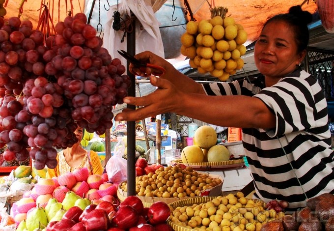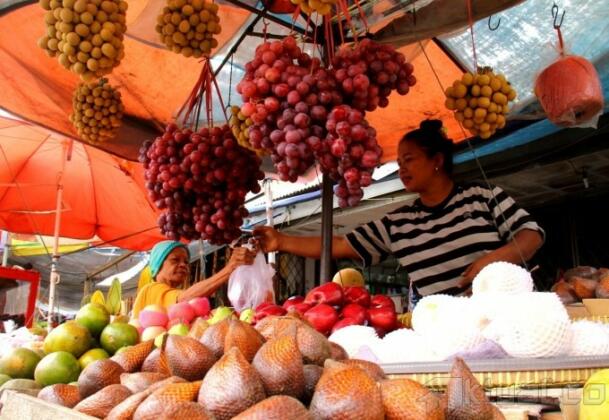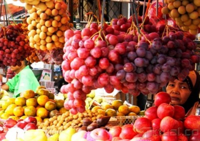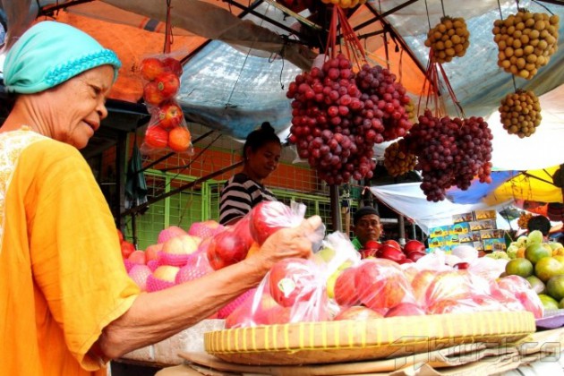Seorang pedagang buah melayani pembeli di Pasar Rumput, Jakarta, Rabu (17/7). Penjualan buah meningkat di bulan Ramadhan, peningkatan terjadi karena banyaknya permintaan untuk berbuka puasa. Aktual/Oke Dwi Atmaja