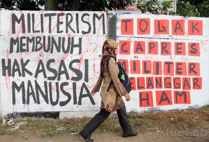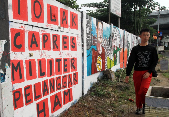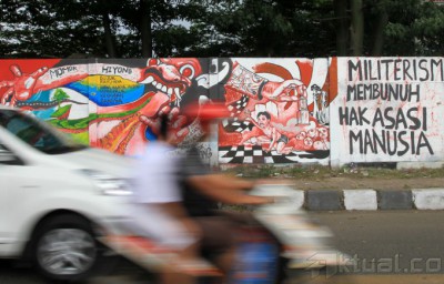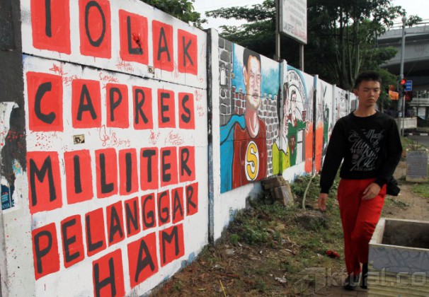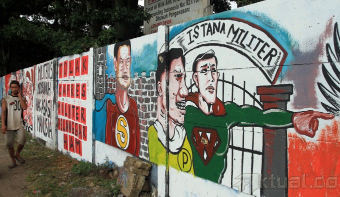 Kendaraan melintas diantara prasasti mural Tragedi Trisaksti dan Mei 1998 di kawasan Jalan Pemuda, Jakarta Timur, Senin (12/5/2014). Persemian mural tersebut bertujuan mengingatkan kepada pemerintah dalam penuntasan peristiwa pelanggaran HAM berat dan sebuah gerakan melawan lupa melalui peresmian Mural Prasasti Tragedi Trisakti dan Mei 1998. Aktual/Tino Oktaviano