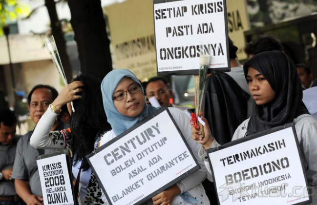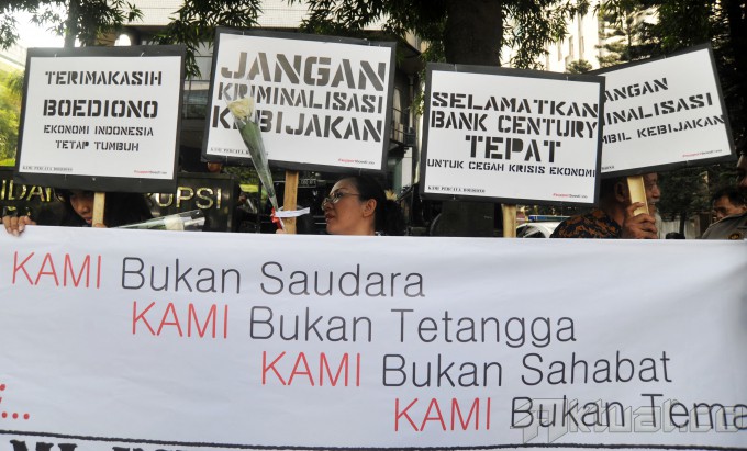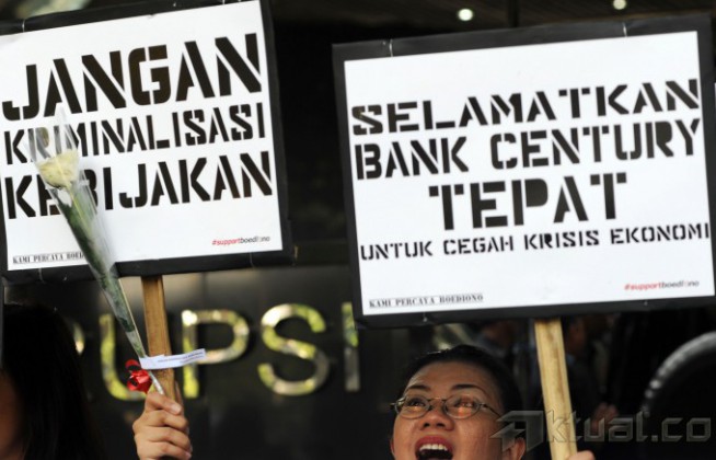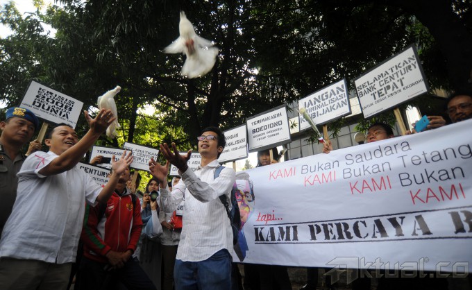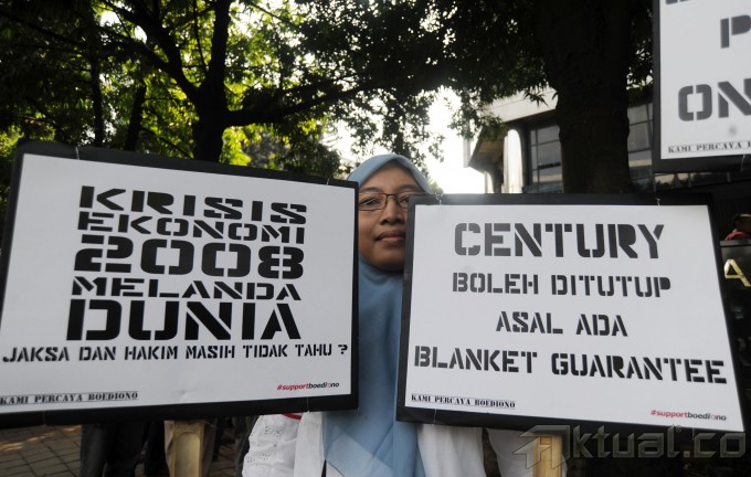 Sekitar 50 pendukung Boediono yang tergabung dalam komunitas Kami Percaya Boediono menggelar aksi simpatik di depan Pengadilan Tipikor, Jumat (9/5/2014). Aksi simpatik tersebut merupakan bentuk dukungan kepada Boediono yang sedang menjadi saksi atas persidangan dengan terdakwa Budi Mulya. Aksi ini adalah wujud dukungan karena kami yakin bahwa keputusan Pak Boediono membailout Bank Century adalah untuk menyelamatkan Indonesia dari krisis dunia 2008. Aktual/Tino Oktaviano