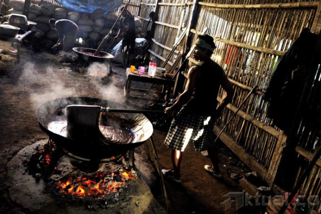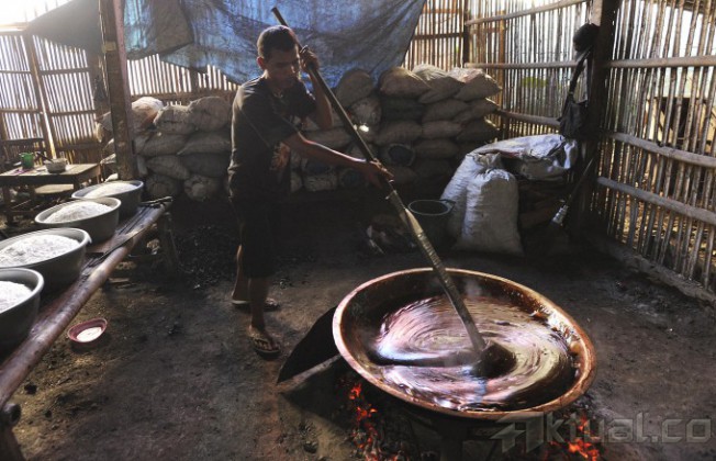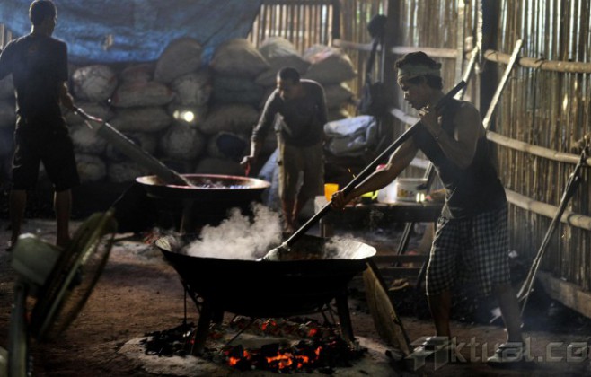 Pekerja sibuk menyelesaikan pembuatan dodol Betawi di kawasan Cilenggang, Tangerang Selatan, Banten, Jumat (18/7/2014). Sebagai pelengkap sajian di hari raya, Seperti tahun-tahun sebelumnya, Kue yang dijadikan tradisi makanan khas saat lebaran oleh sebagian memang selalu ada saat menjelang Idul Fitri. Aktual/Tino Oktaviano
