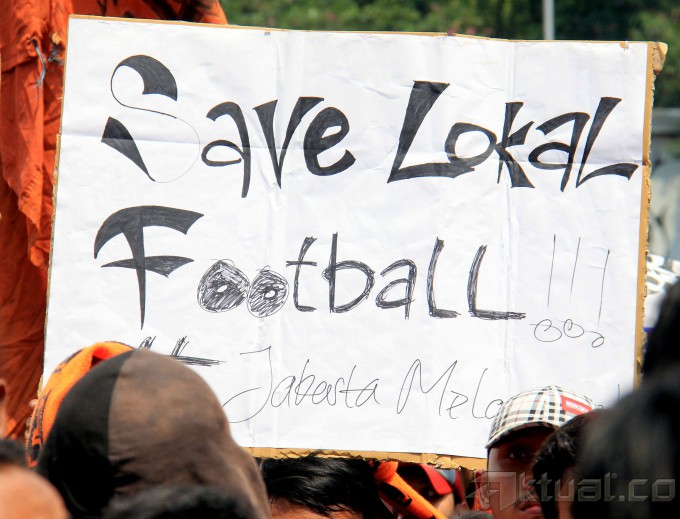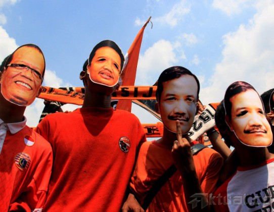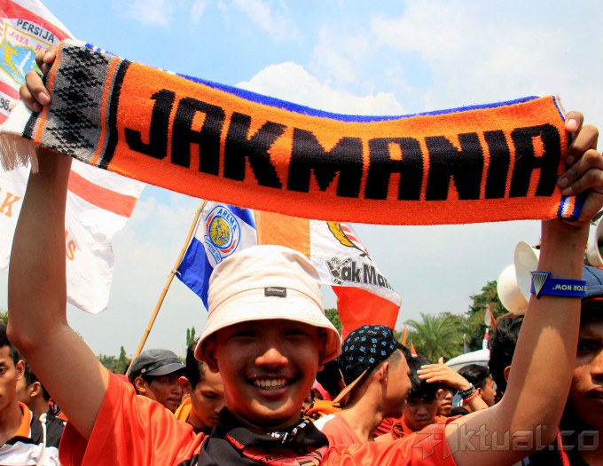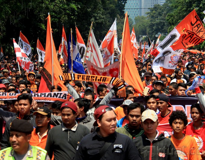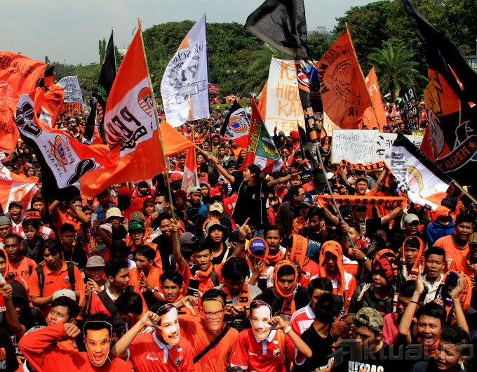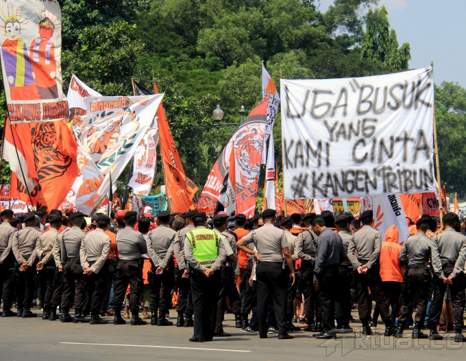 Ribuan seporter Persija Jakarta (JakMania) melakukan aksi unjuk rasa di Istana Negara, Jakarta Pusat, Selasa (5/5/2015). The JakMania meminta agar Presiden Jokowi untuk turun tangan menyelesaikan konflik antara Kemenpora dan PSSI yang berdampak pada kelangsungan persepakbolaan di Indonesia khususnya liga. AKTUAL/MUNZIR