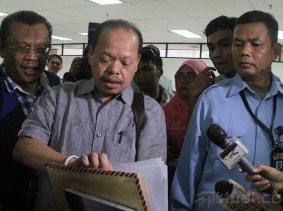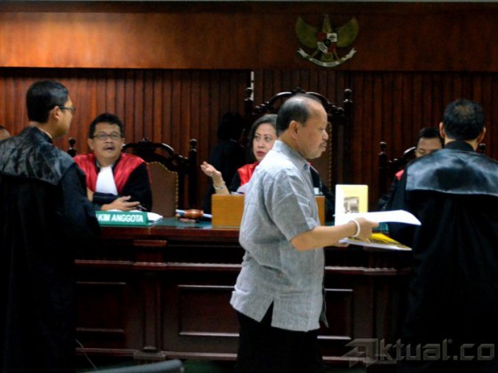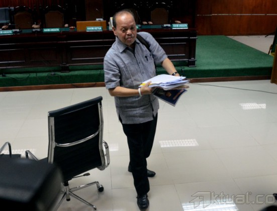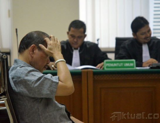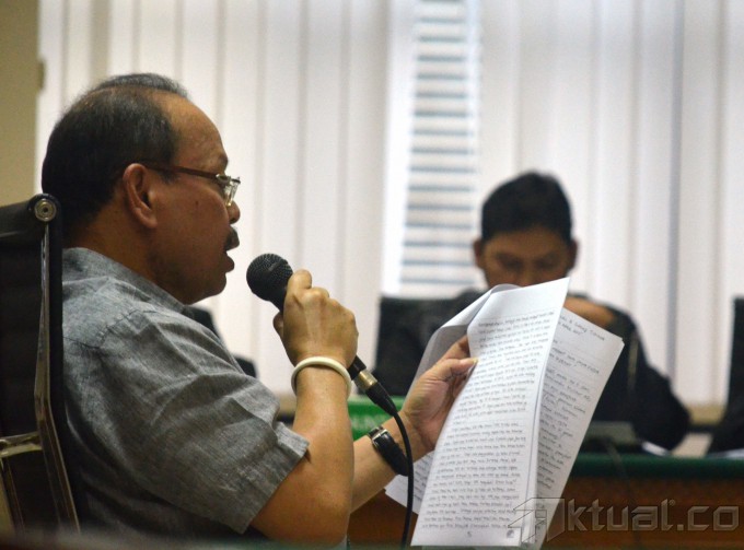 Tersangka dugaan suap, Sutan Bhatoegana saat membacakan surat eksepsinya di Pengadilan Tindak Pidana Korupsi (Tipikor), Jakarta Selatan, Senin (20/4/2015). Dalam eksepsi Sutan Bhatoegana menolak dakwaan yang dibacakan oleh Jaksa Penuntut Umum (JPU) KPK. AKTUAL/MUNZIR