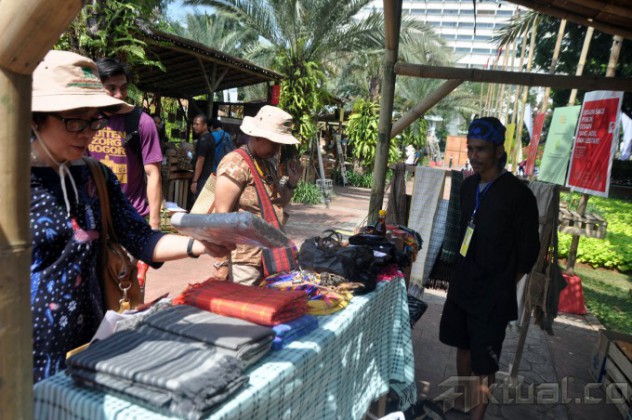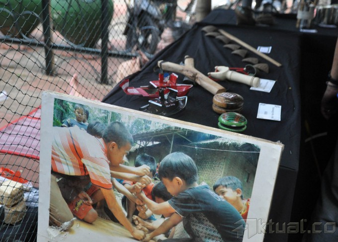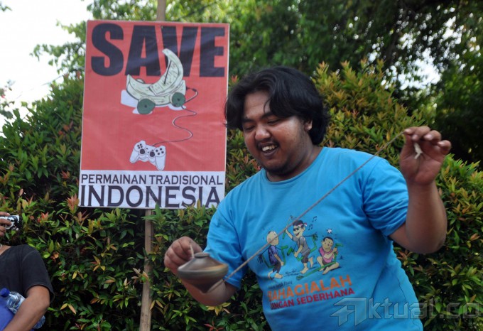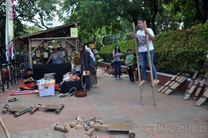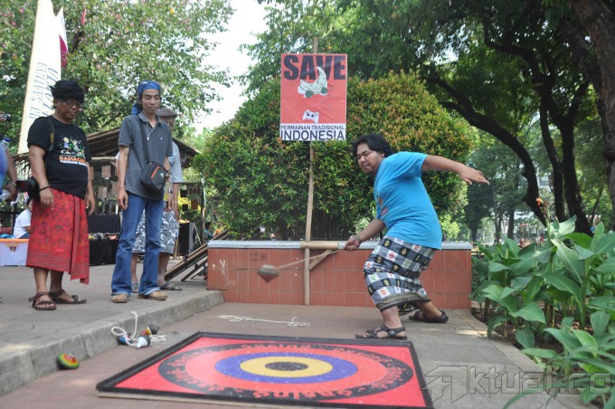 Pengunjung mencoba permainan tradisional Indonesia pada acara Panen Rakyat di Lapangan Banteng, Jakarta, Sabtu (5/6/2105). Permainan khas tradisional Indonesia nyaris punah dan dilupakan, bahkan sudah nyaris tidak kita jumpai dimasyarakat. Permainan era teknologi berangsung menggerus permainan tradisional Indonesia. AKTUAL/JUNAIDI MAHBUB