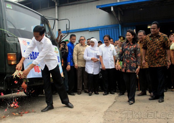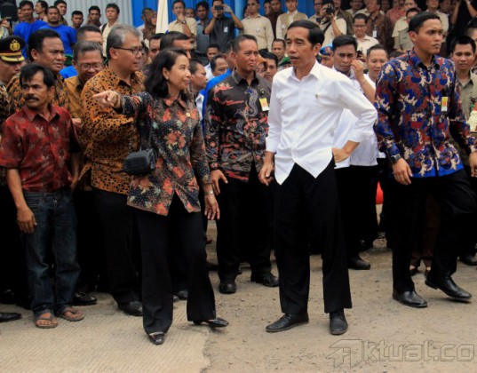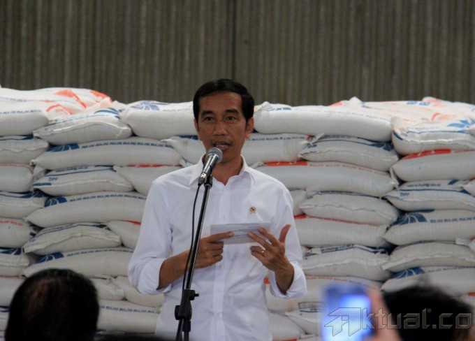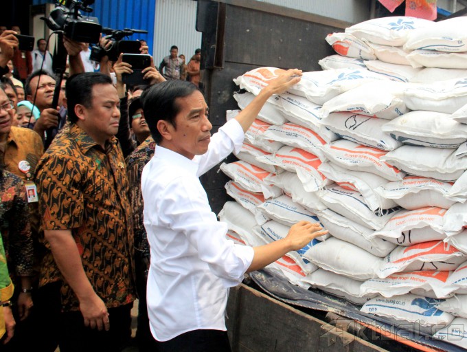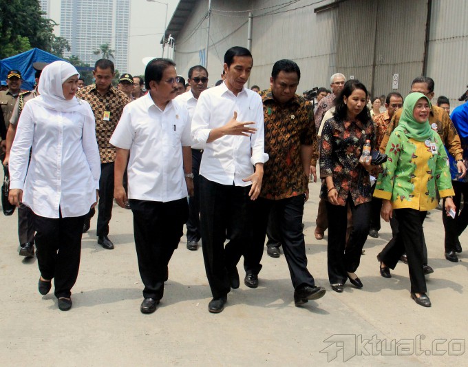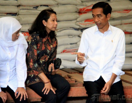 Presiden RI Joko Widodo alias Jokowi (ketiga kanan) didampingi Menteri Sosial Khofifah Indar Parawansa (ketiga kiri), Menteri BUMN Rini Soemarno (keempat kiri), Menko Perekonomian Sofyan Djalil (kedua kanan) dan Menteri Perdagangan Rahmat Gobel (kanan) berbincang saat meninjau stok beras di gudang beras Perum Bulog, Kelapa Gading, Jakarta, Rabu (25/2/2015). Dalam kesempatan tersebut, Presiden Jokowi secara simbolis menyalurkan beras untuk keluarga miskin (raskin) dan operasi pasar beras sebanyak 300 ribu ton. AKTUAL/MUNZIR