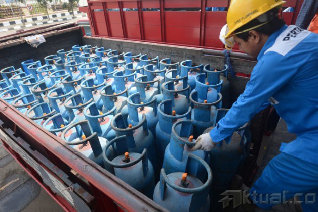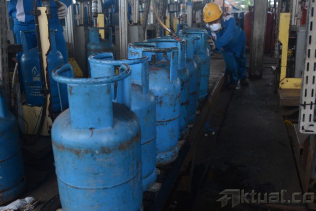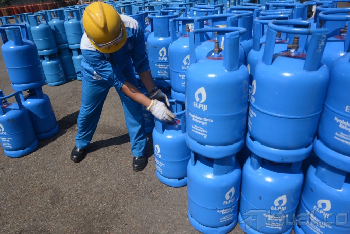 Petugas memindahkan tabung gas 12 kg di Stasiun Pengisian Bahan Bakar Elpiji (SPBE) Patra Trading, Plumpang, Jakarta, Rabu (27/5). Realisasi penjualan LPG Pertamina hingga april 2015 tercatat mencapai 2,05 juta metric ton atau meningkat sekitar 6% dibandingkan dengan penyaluran pada periode yang sama tahun 2014 dan menjelang puasa Pertamina mempertahankan ketersediaan stok LPG nasional sekitar 19 hari. ANTARA FOTO/HO/PRIYO