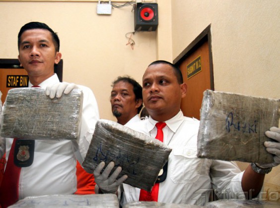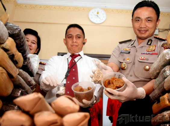 Wakapolres Metro Jakarta Selatan AKBP Surawan (ketiga kiri) didampingi Kepala Satuan Narkoba Polres Metro Jakarta Selatan AKBP Hando Wibowo (kedua kiri) menunjukan barang bukti Narkoba berupa cookies ganja pada gelar perkara kasus narkoba jenis ganja, extacy dan sabu di Polres Jakarta Selatan, Senin (27/4/2015). Satuan Narkoba Polres Metro Jakarta Selatan berhasil mengamankan enam orang tersangka dari tiga kasus berbeda dengan barang bukti berupa 200 kg ganja, 1000 butir ekstasi, 9,4 kg sabu, serta tiga kotak kue cookies yang mengandung ganja. AKTUAL/MUNZIR