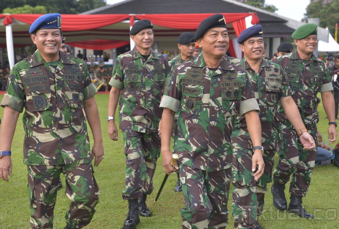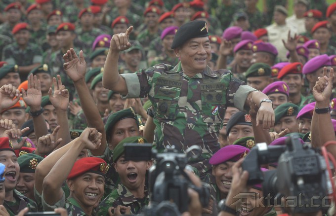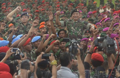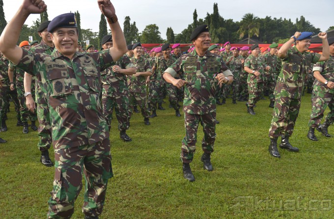 Panglima TNI Jenderal TNI Moeldoko (kanan) dan KSAL Laksamana TNI Ade Supandi (kiri) berjoget bersama prajurit TNI ketika berlangsungnya olahraga bersama di Mako Kopssus Cijantung, Jakarta Timur, Jumat (6/1). Kegiatan yang diikuti semua unsur TNI itu selain untuk bersilahturahmi, juga guna mempererat kesatuan di antara prajurit TNI. ANTARA FOTO/Saptono/Spt/15