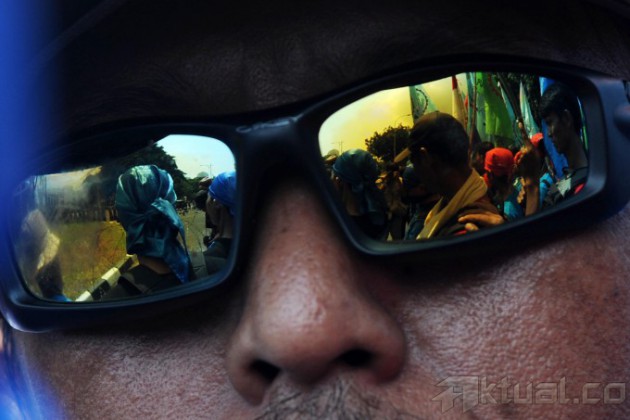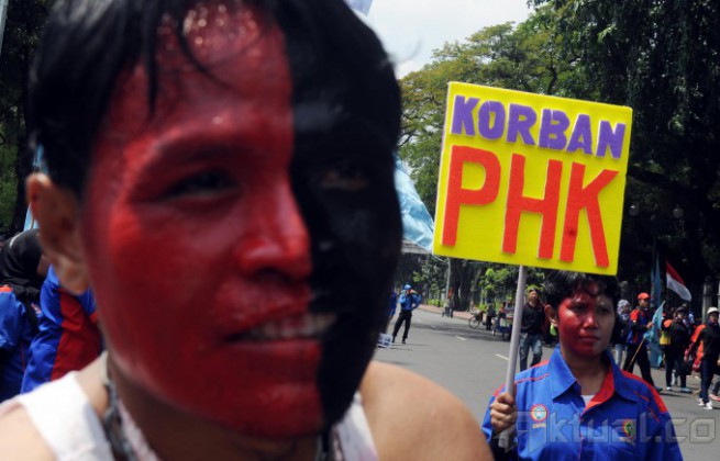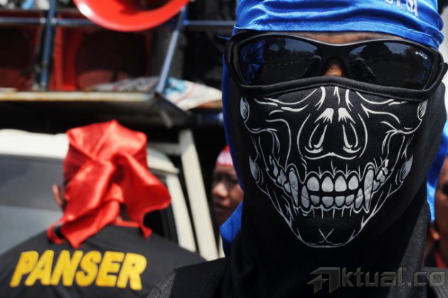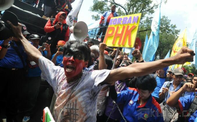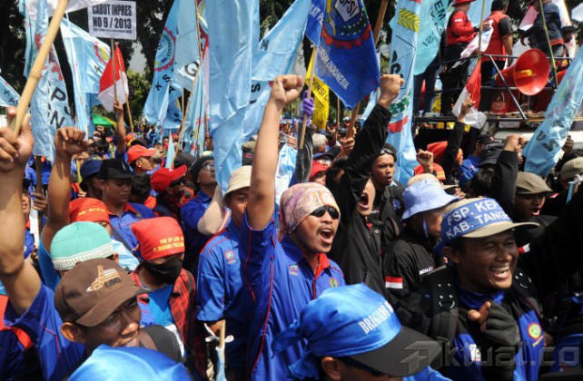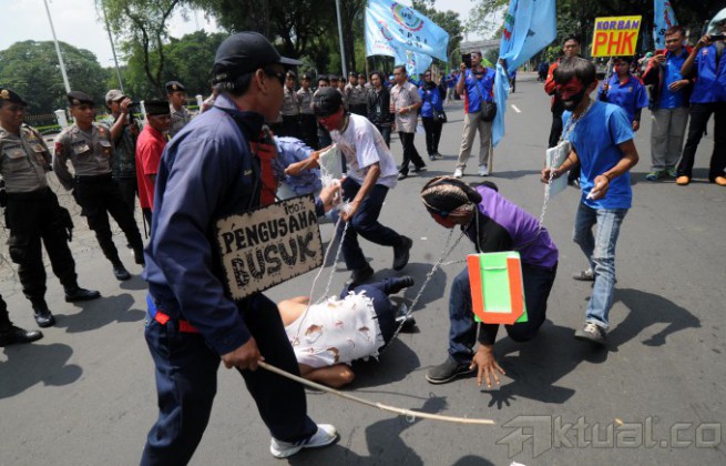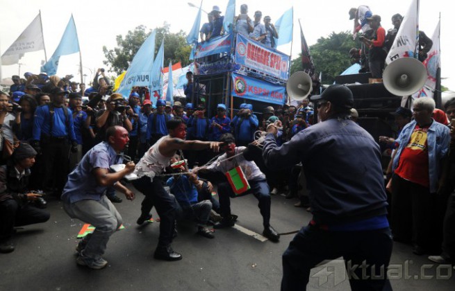 Sejumlah buruh melakukan teaterikal saat melakukan aksi memperingati hari buruh di depan Istana Negara, Jakarta, Jumat (2/5/2014). Buruh menyampaikan 10 poin tuntutan. Buruh mendesak pemerintah menaikkan gaji sebesar 30 persen dari upah minimum regional (UMR) Rp2,8 juta. Dan komponen kebutuhan hidup layak (KHL) direvisi menjadi 84 item, serta menolak penangguhan upah minimum. Aktual/Jefta