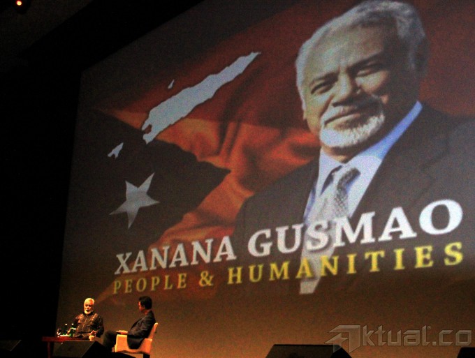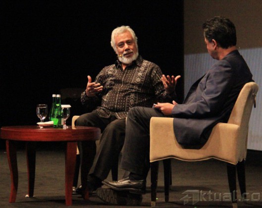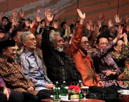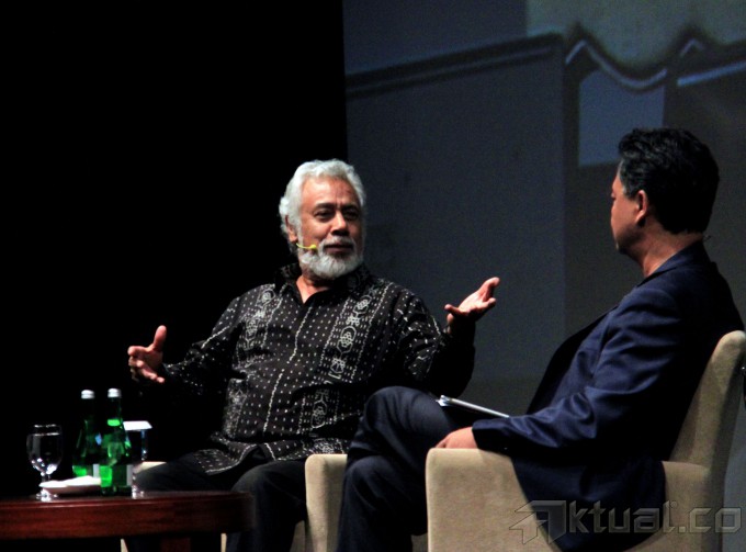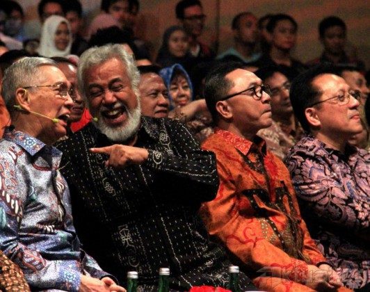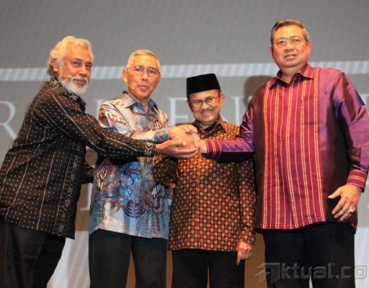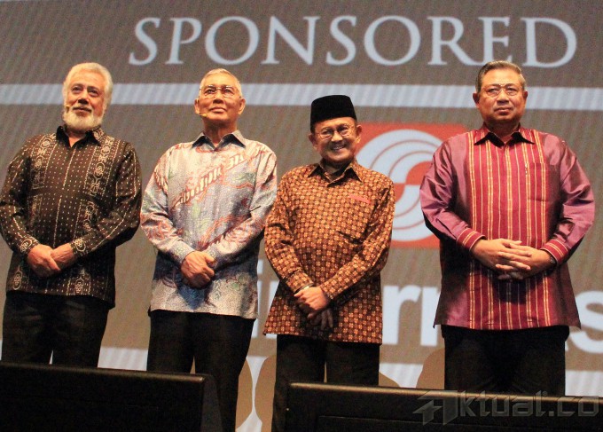 Presiden pertama Timor Leste Xanana Gusmao, Wakil Presiden RI 6 Try Sutrisno, Presiden RI 3 BJ Habibie, Presiden RI 6 Susilo Bambang Yudhoyono bersalaman saat mengisi acara Supermentor-6: Leaders, Jakarta, Minggu (17/5/2015), malam. Xanana menyampaikan pandangannya mengenai filosofi hidup, resep Sukses, etos kerja dan llmu kepemimpinan bersama tokoh negarawan BJ Habibie, Susilo Bambang Yudhoyono, dan Try Sutrisno dalam rangka menyambut Hari Kebangkitan Nasional ke-107. AKTUAL/MUNZIR