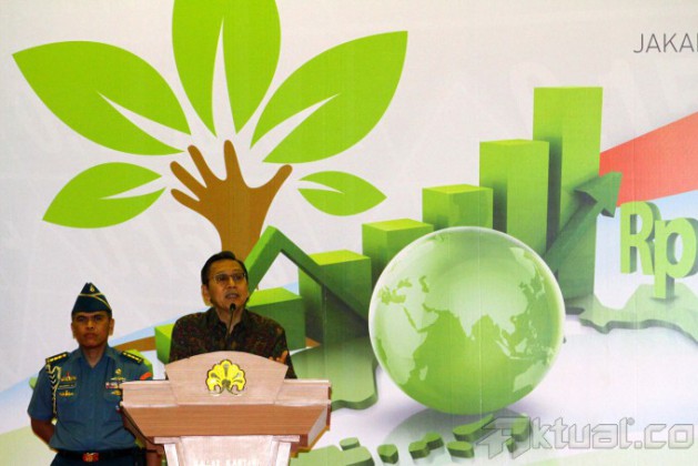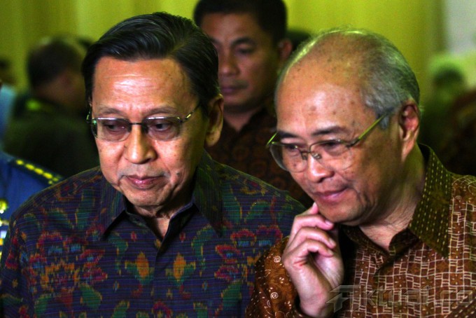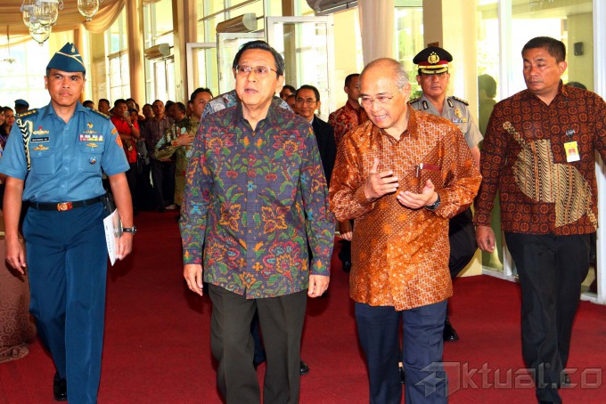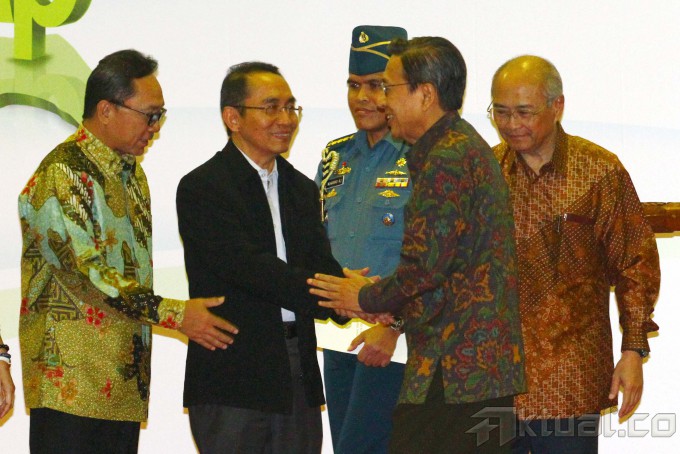 Wakil Presiden Boediono (kedua kanan), Kepala Badan Pengawas Keuangan dan Pembangunan Mardiasmo (dari kiri), Wakil Menteri Keuangan Anny Ratnawati, Menteri Kehutanan Zulkifli Hasan, dan Wakil Ketua Komisi Pemberantasan Korupsi Adnan Pandu Praja, berbincang bersama disela-sela acara rapat pembekalan instrumen Tata Kelola Keuangan dan Inisiatif Tata Kelola Hutan dan Lahan di Jakarta, Senin (15/9/2014). Dana APBD Pemerintah Provinsi DKI Jakarta hingga semester I/2014 baru terserap 15,4% dari Rp72 triliun. AKTUAL/TINO OKTAVIANO