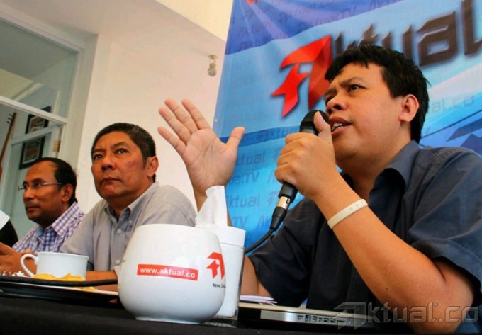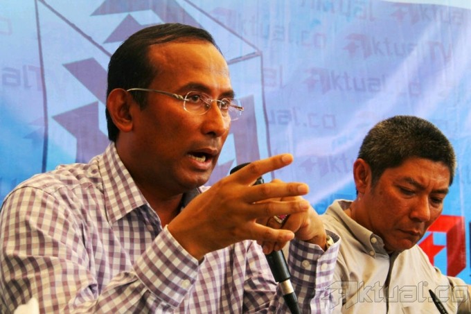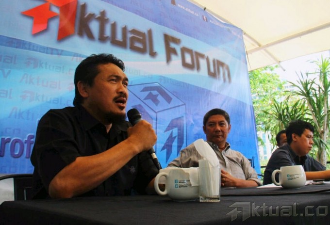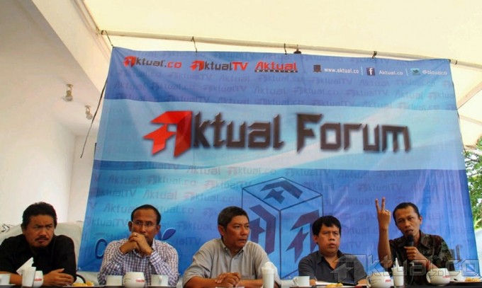 Dari kiri ke kanan Pengamat Intelijen Islam Umar Abduh, Anggota DPR Komisi VII Fraksi Partai Golongan Karya, Moderator yang juga Redaktur Senior Aktual Hendrajit, Direktur Investigasi dan Advokasi FITRA Uchok Sky KhadafiUchok dan Peneliti Indonesia Coruption Watch (ICW) Firdaus Ilyas menjadi pembicara dalam diskusi Aktual Forum dengan tema Peta Jalan Migas Nasional : Kepentingan Rakyat Vs Politik Kartel di Warung Komando, Tebet, Jakarta Selatan, Senin (26/8). Dalam diskusi tersebut DPR meminta alokasi pendapatan Minyak dan Gas Bumi (Migas) lebih besar lagi digunakan untuk pencarian cadangan dan ladang migas baru. Aktual/Oke Dwi Atmaja