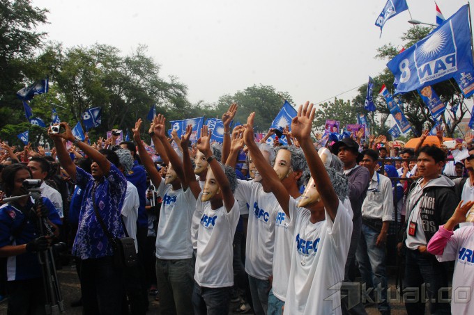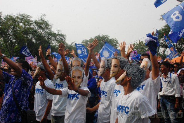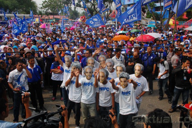 Kembaran Hatta Rajasa memeriahkan kampanye PArtai Amanat Nasional (PAN), saat berkampanye di Gelanggang Olahraga H Agus Salim, Sabtu (29/3/2014). Ketua Umum PAN Hatta Rajasa dikagetkan dengan kehadiran ratusan kembarannya, yang berasal dari relawan Hatta Rajasa Fans Community (HRFC) Cabang Sumatera Barat. Mereka berbaur dengan ribuan kader PAN sambil mendengarkan Hatta yang sedang melakukan orasi politik. Aktual/Ist