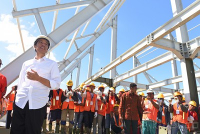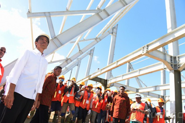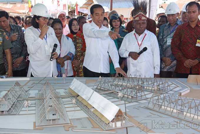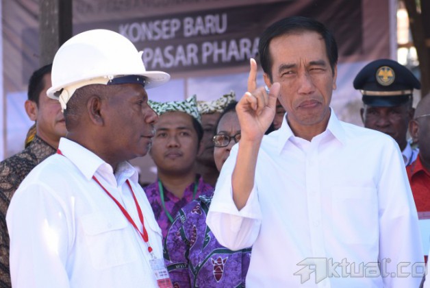 Presiden Joko Widodo meninjau pembangunan Pasar dan Terminal Pharaa, Sentani, Jayapura, Papua, Sabtu (9/5). Pasar dan terminal yang akan terintegerasi itu rencananya bakal menjadi percontohan nasional. ANTARA FOTO/Hafidz Mubarak A