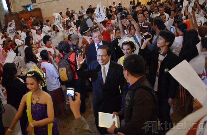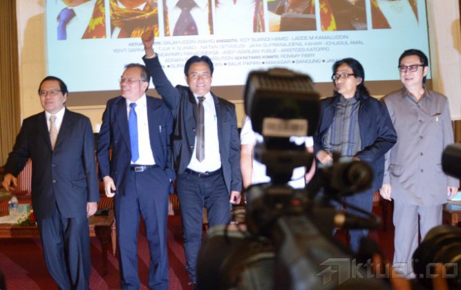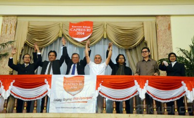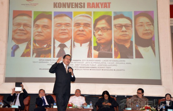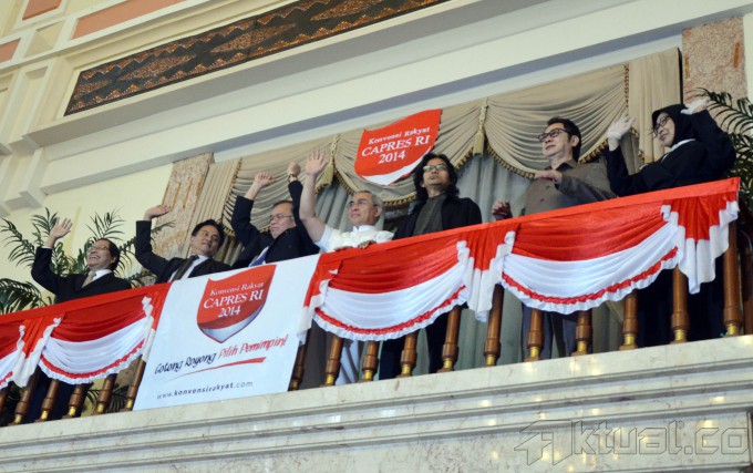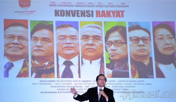 Tujuh kandidat Capres RI Konvensi Rakyat 2014, dari kiri ke kanan, Rizal Ramli, Yusril Ihza Mahendra, Sofyan S Siregar, Isran Noor, Tonny Ardie, Ricky Susanto dan Anni Iwasaki, Debat Publik Capres Konvensi Rakyat 2014 di Balai Sudirman, Jakarta Selatan, Rabu, (12/3/2014). Debat ini dihadiri ratusan audiens dan empat tokoh nasional yang dihadirkan untuk menjadi panelis. Mereka pakar etika politik dari Sekolah Tinggi Filsafat Driyarkara Franz Magnis Suseno, budayawan Jaya Suprana, pengamat politik-militer Salim Said, dan Wakil Ketua MPR Lukman Hakim Saifuddin. Aktual/Tino Oktaviano