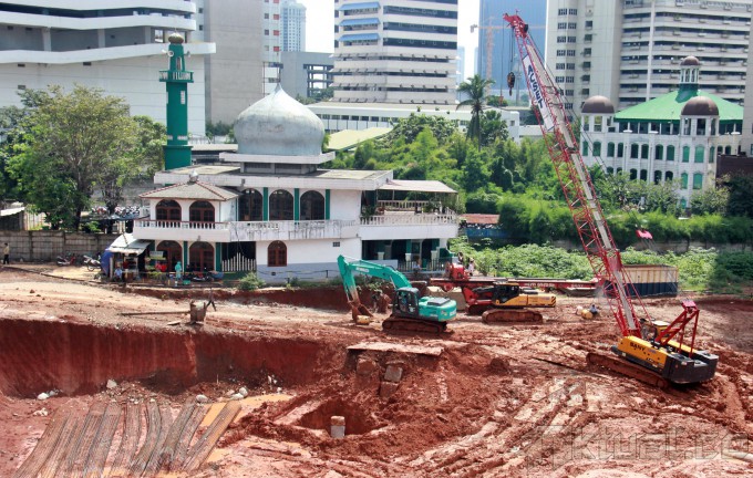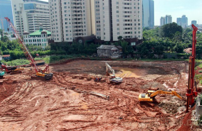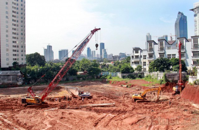 Beberapa alat berat mengerjakan proyek pembagunan gedung bertingkat di kawasan Semanggi, Jakarta, Senin (16/6/2014). Perhelatan akbar politik, Pemilihan Presiden 2014 ternyata tak mampu membuat pengembang properti gentar meluncurkan proyek baru. Tahun ini, Sinarmas Land memasarkan Casa de Marco. Proyek tersebut merupakan apartemen empat menara. Dua menara di antaranya sudah dipasarkan seharga Rp 14 juta per meter persegi. PT Metropolitan Kentjana Tbk., melansir apartemen mewah Pondok Indah Residence terdiri dari tiga menara dengan harga per unit Rp 2,9 miliar hingga Rp 6 miliar. PT Pakuwon Jati Tbk, akan membesut dua proyek Kota Kasablanka Tahap II, yakni apartemen Bella Tower dan perumahan skala kota Grand Pakuwon seluas 128 hektar. Dua proyek ini akan dibiayai oleh dana belanja modal tahun ini yang anggarannya sebesar Rp 1,8 triliun. Aktual/Tino Oktaviano