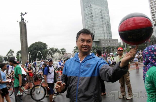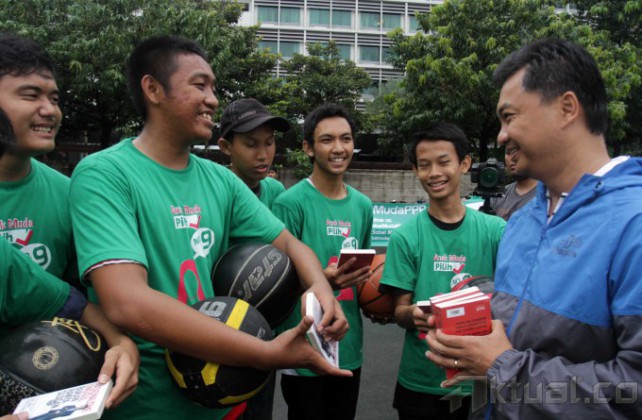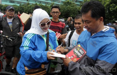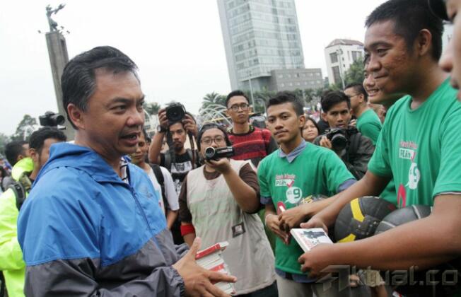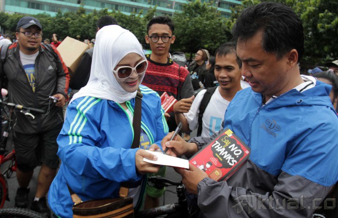 Senyum Dino Patti Djalal saat membagikan buku kepada pengunjung Car Free Day di Bundaran HI, Jakarta, Minggu (23/3/2014). Buku setebal 203 halaman ini berjudul ‘Nasionalisme Unggul: Bukan hanya Slogan’. Aktual/Tino Oktaviano