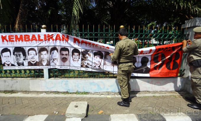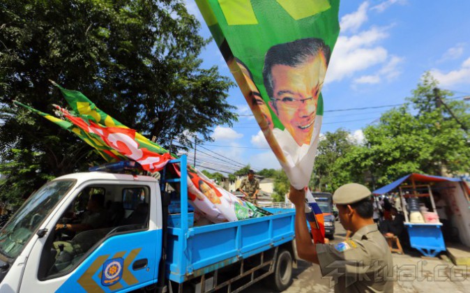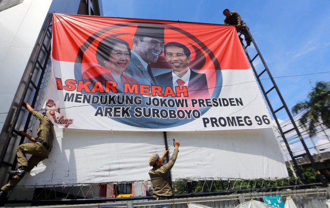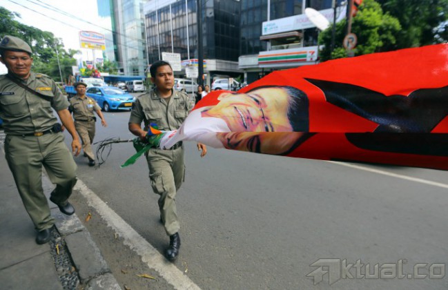Petugas Satuan Polisi Pamong Praja (Satpol PP) menertibkan spanduk capres tanpa ijin di kawasan Menteng, Jakarta Pusat, Kamis (29/5/2014). Pemerintah Provinsi (Pemprov) DKI Jakarta melakukan penertiban spanduk ini atas perintah langsung yang diberikan kepada Satpol PP oleh Gubernur DKI Jakarta Joko Widodo (Jokowi). Aktual/Tino Oktaviano