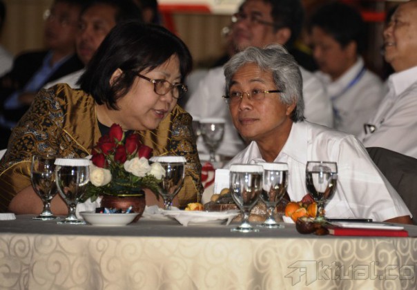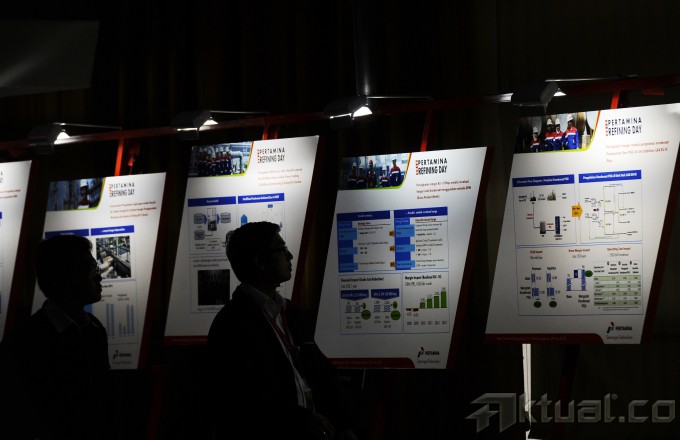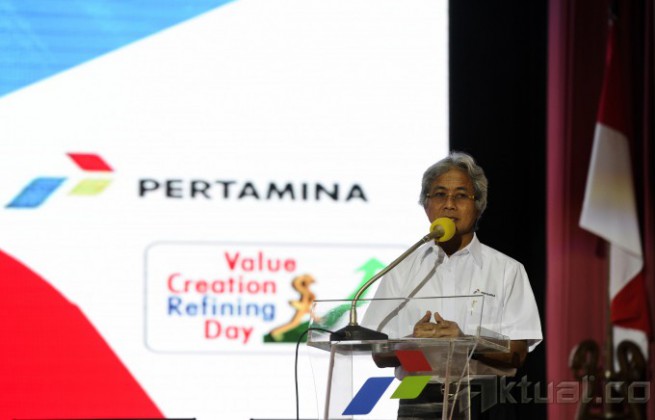 Direktur Utama Pertamina Dwi Soetjipto (kanan) berbincang dengan Direktur Energi Baru Yenni Andayani (kiri) saat pembukaan Pertamina Refining Day Value Creation di Kantor Pertamina Pusat Jakarta, Kamis (29/1). Pertamina berharap melalui proyek Refining Development Masterplan Program (RDM) dapat meningkatkan kemampuan produksi hingga 1,6 juta barel per hari dengan fleksibilitas kilang yang meningkat. ANTARA FOTO/Wahyu Putro