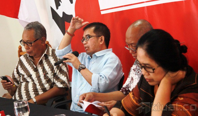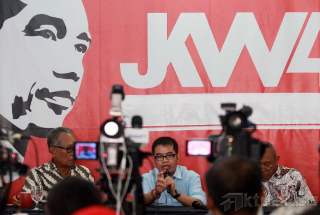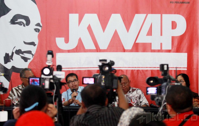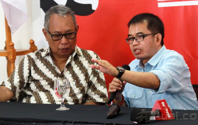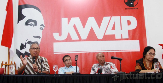 Dari kiri ke kanan, Profesor Sosiolog dari Universitas Indonesia Prof. Thamrin Amal Tomagola, Pengamat politik dari Lembaga Ilmu Pengetahuan Indonesia (LIPI), Ikrar Nusa Bhakti, Direktur Eksekutif Reform Institute Yudi Latif dan politikus PDI Perjuangan, Eva Sundari, saat diskusi “Capres Boneka” di Media Center Jokowi, Jakarta, Kamis (8/5/2014). Dalam diskusi tersebut membahas seputar mulai ditunjuknya Joko Widodo (Jokowi) sebagai Calon Presiden dari PDI Perjuangan dan serangan yang dilakukan untuk menurunkan elektabilitas Jokowi. Aktual/Tino Oktaviano