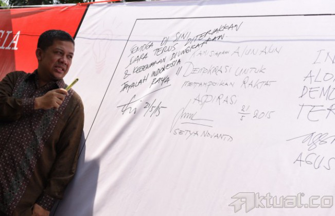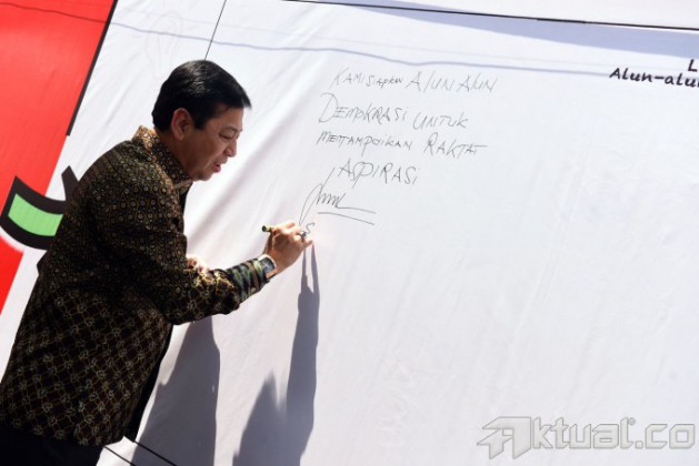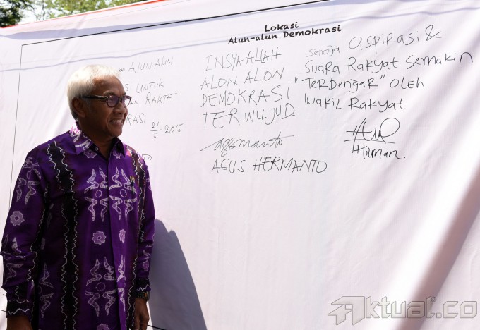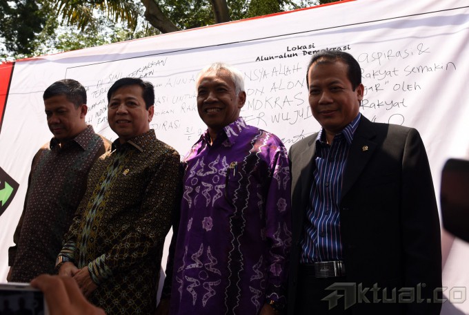 Ketua DPR Setya Novanto, meresmikan rencana pembangunan alun-alun demokrasi di Kompleks Parlemen, Senayan, Jakarta, Kamis (21/5/2015). Alun-alun ini akan dibangun di sisi kiri Kompleks Parlemen, yang saat ini dijadikan sebagai Taman Rusa, lapangan futsal, dan tempat parkir kendaraan. Selain tempat untuk berdemokrasi, pembangunan alun-alun ini juga dilakukan untuk menambah ruang terbuka publik di Ibu Kota. AKTUAL/JUNAIDI MAHBUB