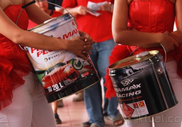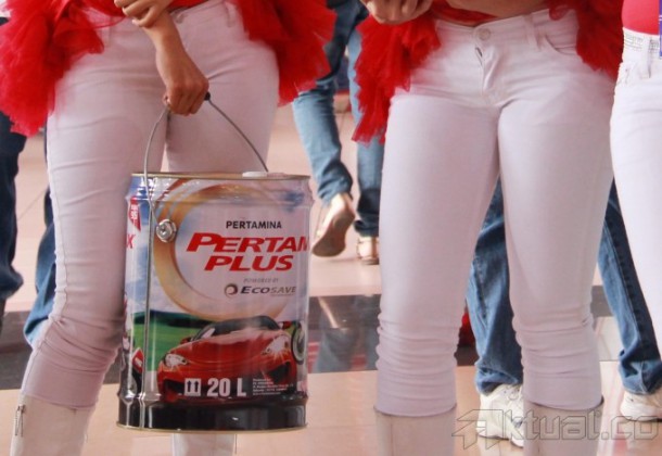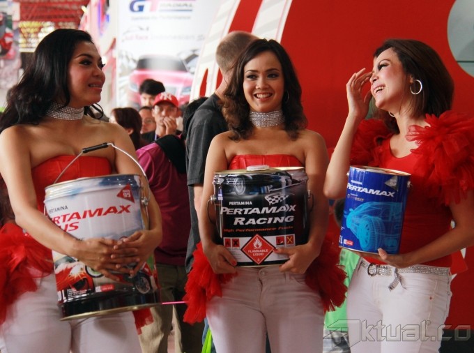Tiga perempuan memperlihatkan Pertamax Series dalam kemasan di both Pertamina di Pameran Indonesia International Motor Show, JIExpo Kemayoran, Jakarta, Sabtu (21/9/2013). produk ini dihadirkan bertujuan sebagai alternatif saat terjadinya kemacetan atau pemilik kendaraan tidak sanggup mencapai Stasiun Pengisian Bahan Bakar Umum. Untuk memberikan kemudahan bagi konsumen, Pertamina menyediakan produk Pertamax Series dalam kemasan kemasan 5, 10 dan 20 liter khususnya untuk daerah-daerah luar kota yang belum memilik SPBU penyedia Pertamax curah, utamanya di luar Jawa. Aktual/Tino Oktaviano