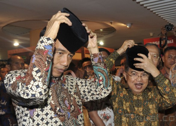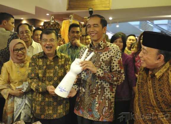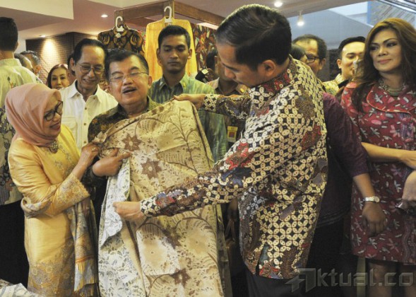 Presiden terpilih Joko Widodo alias Jokowi mencocokkan kain batik untuk Wapres terpilih Jusuf Kalla alias JK saat menghadiri peringatan Hari Batik Nasional di Pasaraya Blok M, Jakarta, Kamis (2/10/2014). Dalam kegiatan ini Jokowi meresmikan Pasaraya Tribute to Batik 2014 dengan menghadirkan Pasar Klewer ke dalam mall. AKTUAL/TINO OKTAVIANO