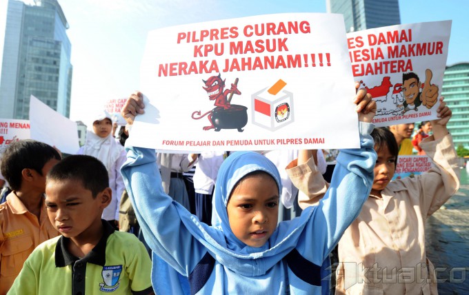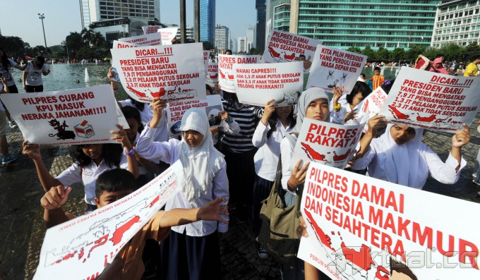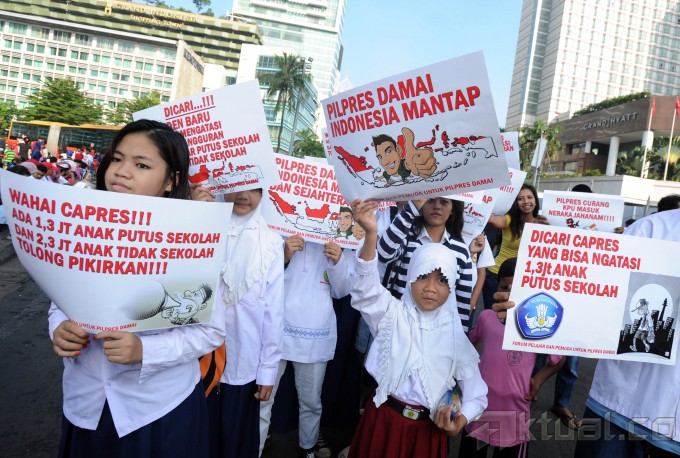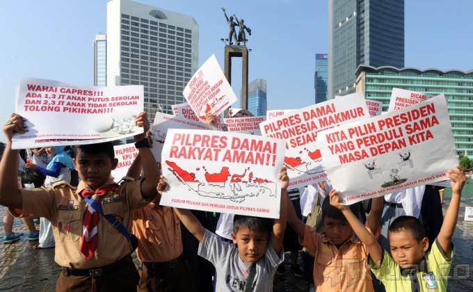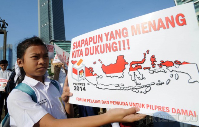 Aksi simpatik para pelajar yang tergabung dalam Forum Pelajar dan Pemuda untuk Pilpres Damai saat melakukan unjuk rasa di Bundaran HI, Jakarta (17/5/2014). Aksi ini mereka lakukan untuk mengimbau kepada masyarakat menciptakan kedamaian selama Pilpres 2014 berlangsung. Aktual/Tino Oktaviano