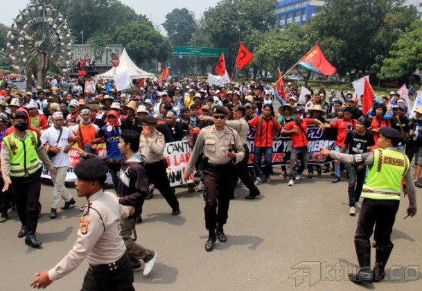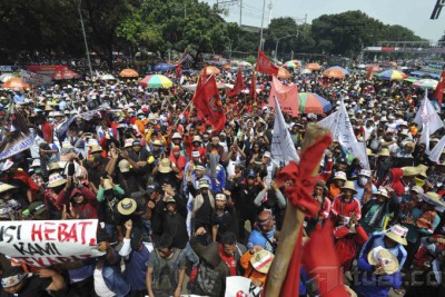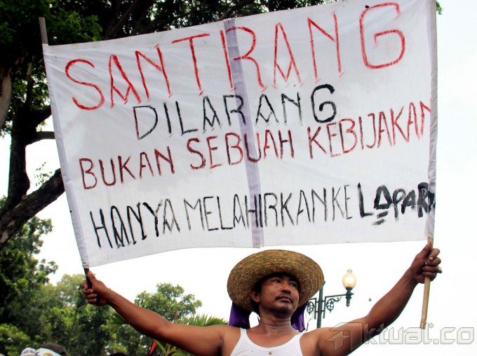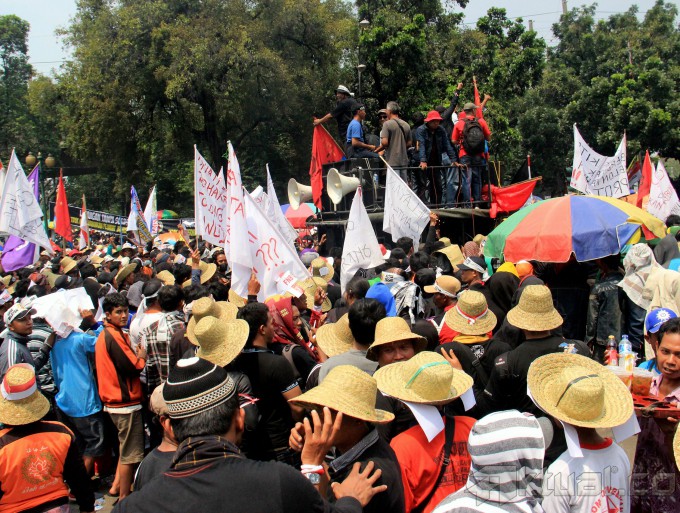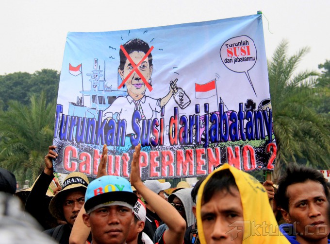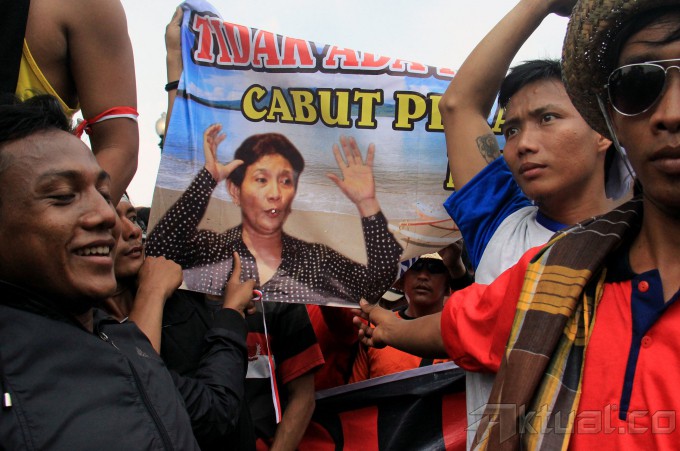 Ribuan nelayan melakukan aksi unjuk rasa di depan kantor Kementerian Kelautan dan Perikanan, di Jakarta, Kamis (26/2/2015). Dalam aksinya ribuan nelayan yang tergabung dalam Front Nelayan Bersatu ini menentang kebijakan Menteri Susi yang menerbitkan Peraturan Menteri (Permen) Nomor 2 tahun 2012 tentang larangan penggunaan cantrang, atau jenis trawl yang telah dimodifikasi untuk menangkap ikan dan meminta Jokowi untuk memecat Menteri Susi. AKTUAL/MUNZIR
